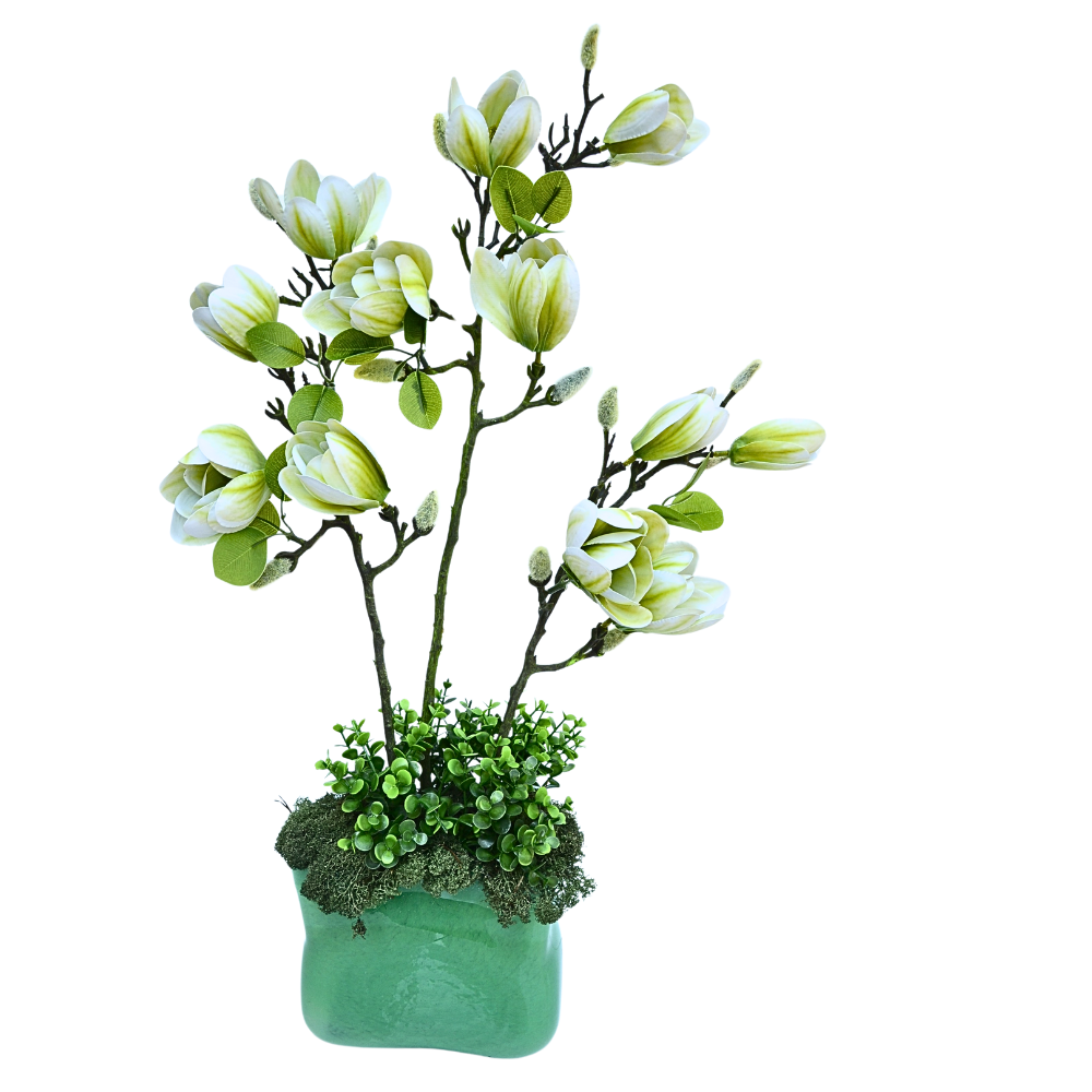 Aranjament floral  creat cu magnolii artificiale verzui-alb pal, aranjate in vaza decorative de sticla.  Creata cu cea mai mare atenție la detalii și fabricată din materiale de calitate superioară, aceaste aranjamente au o viziune realistă si imita perfect magnoliile naturale in armonie cu  muschiul natural care aduce un element de prospețime și un aspect organic, completând perfect florile. Magnolia se incadreaza foarte bine ca design interior elegant pentru birou sau camera de zi.