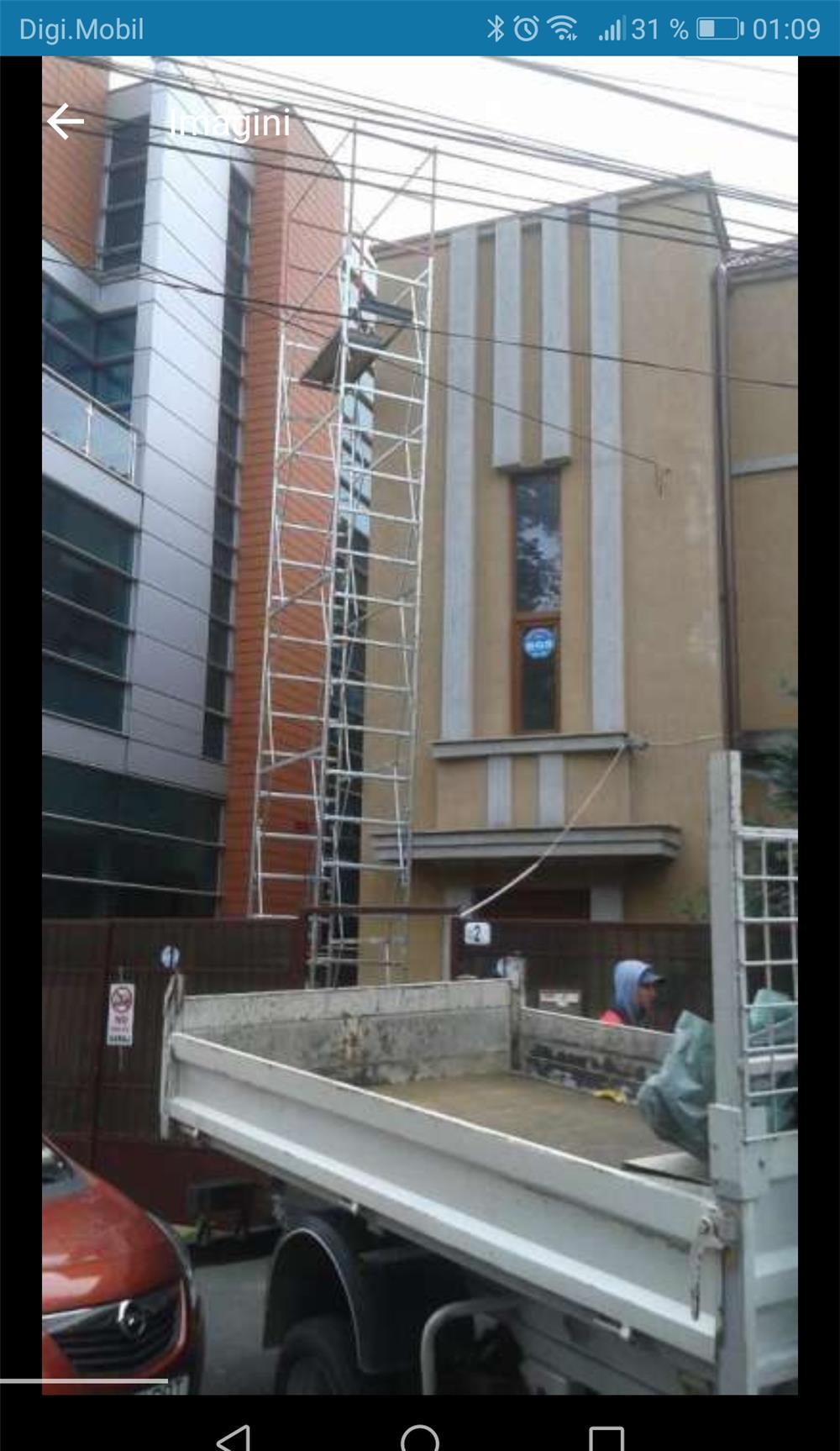 .Inchiriez schela mobila otel galvanizat pentru interior,exterior,Schela Profesional este fabricata din otel (Fe360) zincat electrolitic impotriva ruginii. Produsul ofera o siguranta foarte mare de lucru si usurinta in montaj.Ideala pentru lucrari de exterior si interior,spatii greu accesible:sageacuri,jgeaburi,placari cu polistiren,dat cu structurata sau diverse activitati.caracteristici tehnice:- inaltime de la 1.70m la 11.00m;- dimensiuni 1.70m x 0.85m;- capacitate maxima Kg 200/mq;- etaj schela - inaltime/greutate - 1.20m/25 kg;- baza completa - inaltime/greutate - 50cm/43kg;- roti baza o 200 mm,- cale de siguranta si contravantuiri- etaj de protectie - inaltime/greutate - 1.20m/30kg;- greutate 4 tije stabile Kg 16;- diametru teava: 45 mm.Pretul de inchiriere pe zi calendaristica este de 60 RON peste 3 zile1 zi200 ron +transport2 zile 150 +transportDe la 3 zile în dus prețul este de 70 ron zi calendaristica indiferent de înălțime. Max 8 mTransportul dus-intors 150 ron in București. Pentru detalii si programari va stam la dispozitie la numarul
