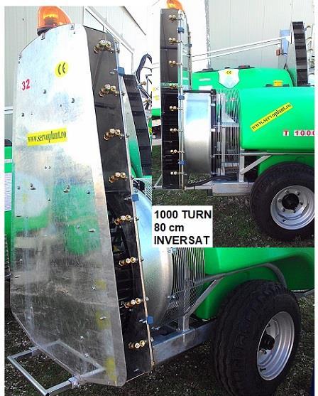 Pompa de stropit in vie si livada bazin 300- 3000 litri, purtate sau tractate, ventilatoare axiale 50-90 cm, standard, turn cu depunere controlata sau cu aspiratie inversa, 10-14 portduze bronz, pompe 40-180 lt/min40-50 bar, distribuitoare de solutie standard sau electrice, arbore cardanic inclus, roti mari acolo unde este cazul, configuratii la cerere mergand pana la calculator de norma.