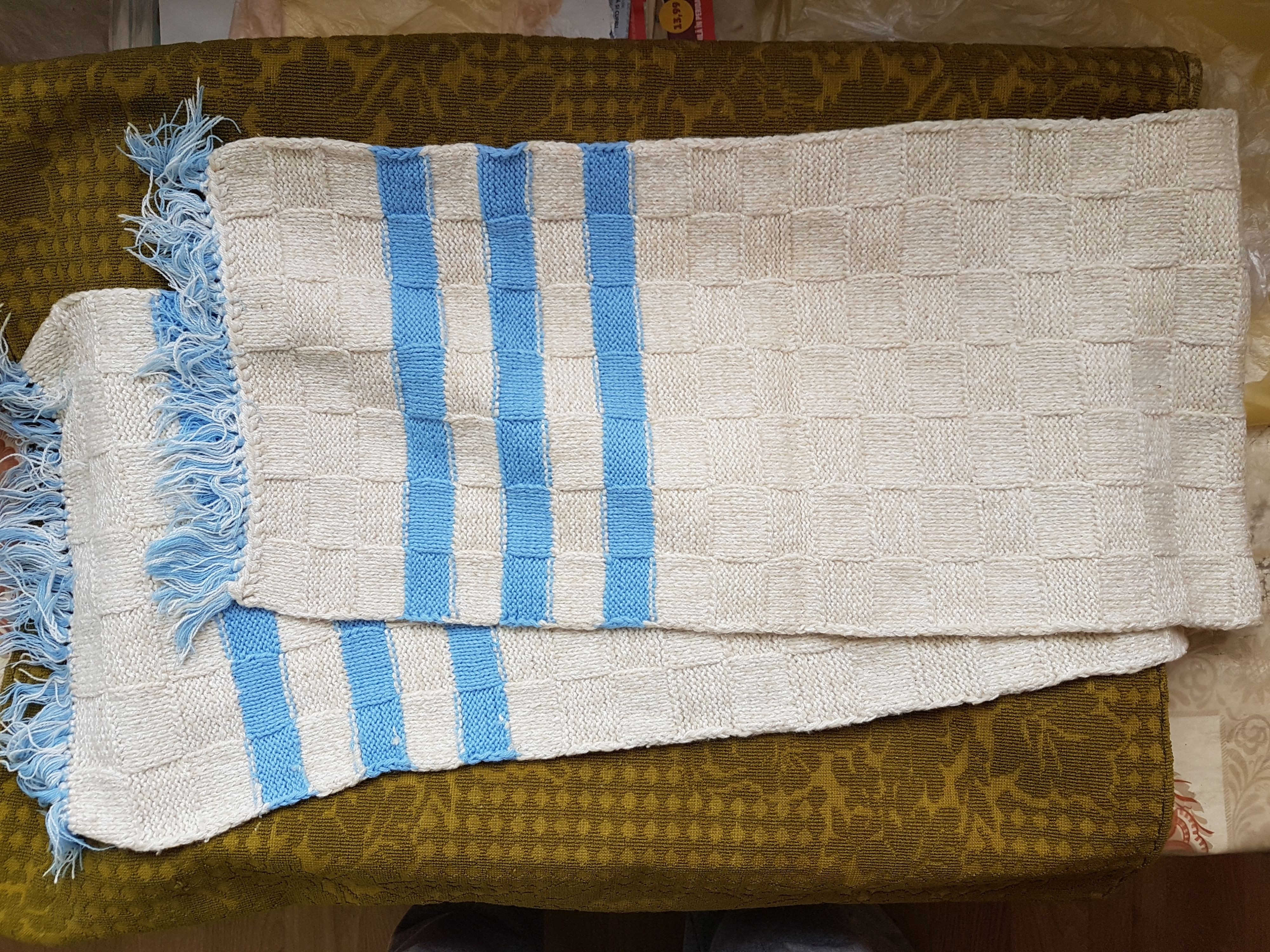 1-Fular lana,culoarea crem,cu dungi albastre.