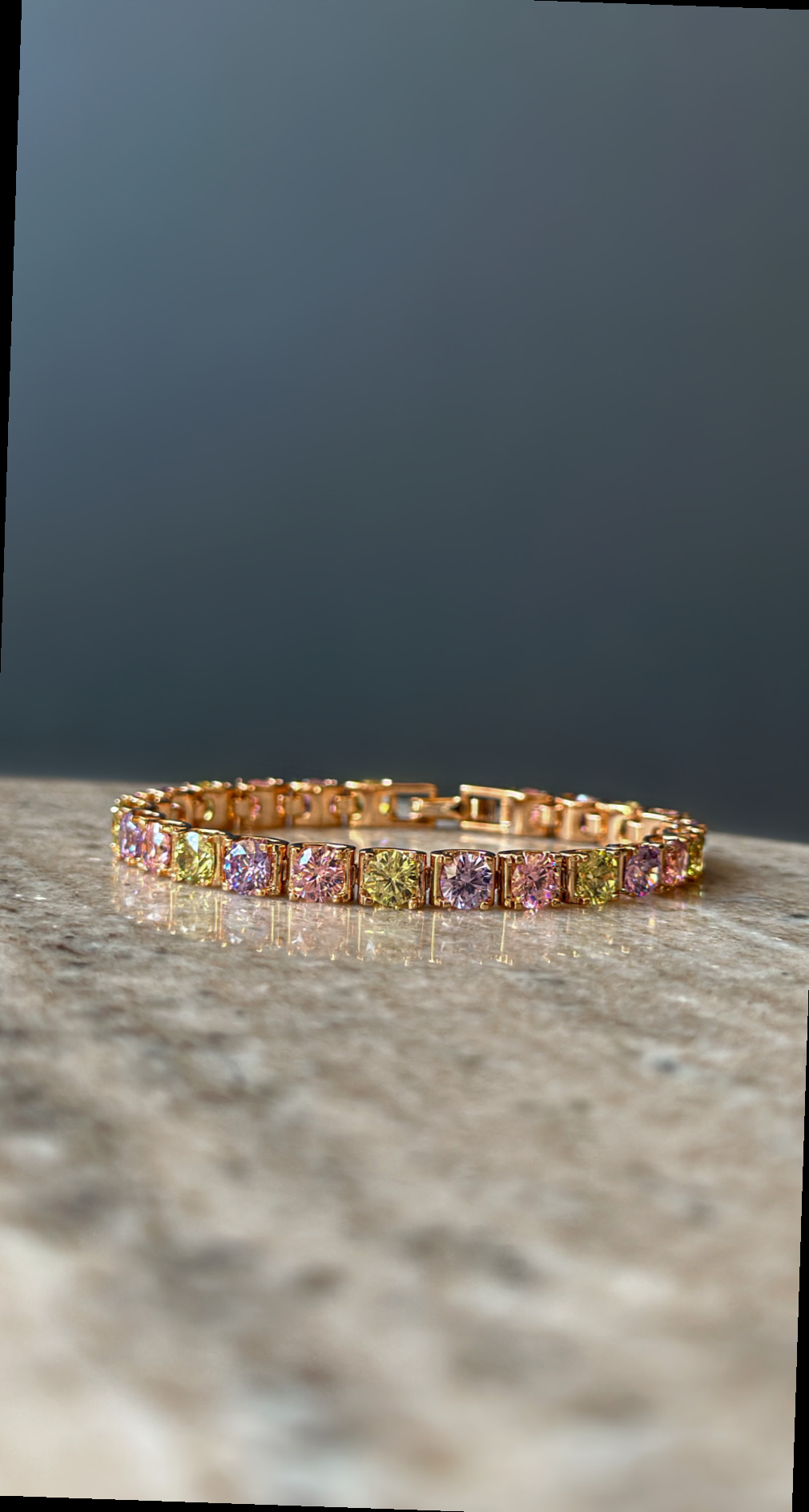 Brățară de tenis placată cu aur roz, disponibilă la reducere! Cu un design multicolor, această brățară este accesoriul perfect pentru a-ți completa ținuta. Realizată din aur, această bijuterie strălucește în orice ocazie