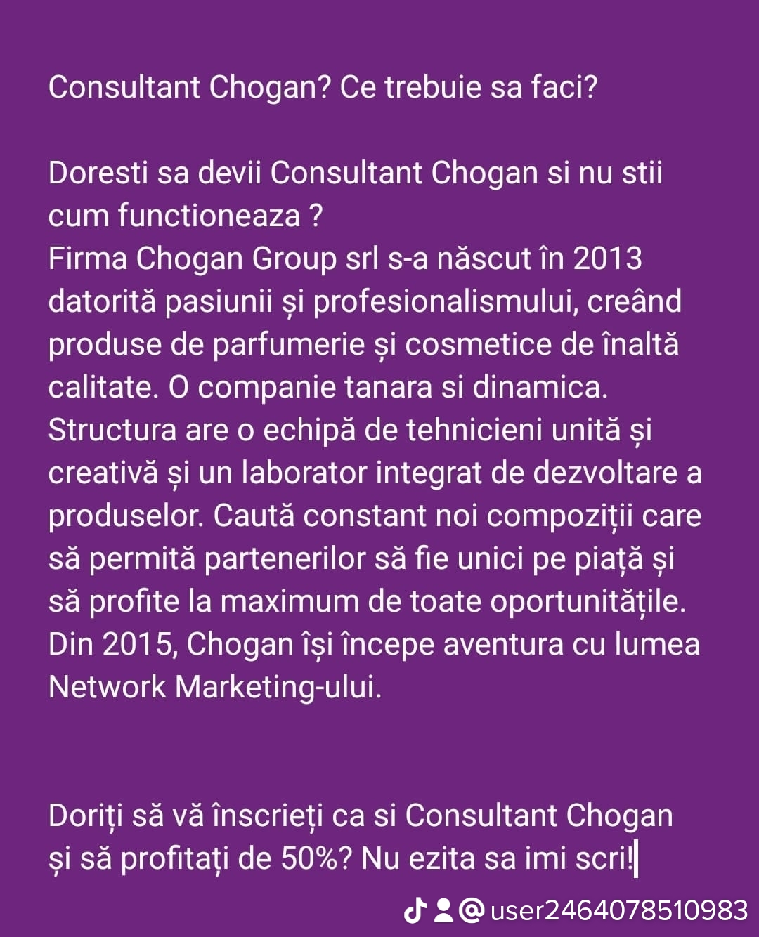 Firma chogan grup srl sa născut în 2013 datorita pasiuni și profesionalismului,creând produse de parfumerie și cosmetice de înaltă calitate.O companie tânără și dinamica.