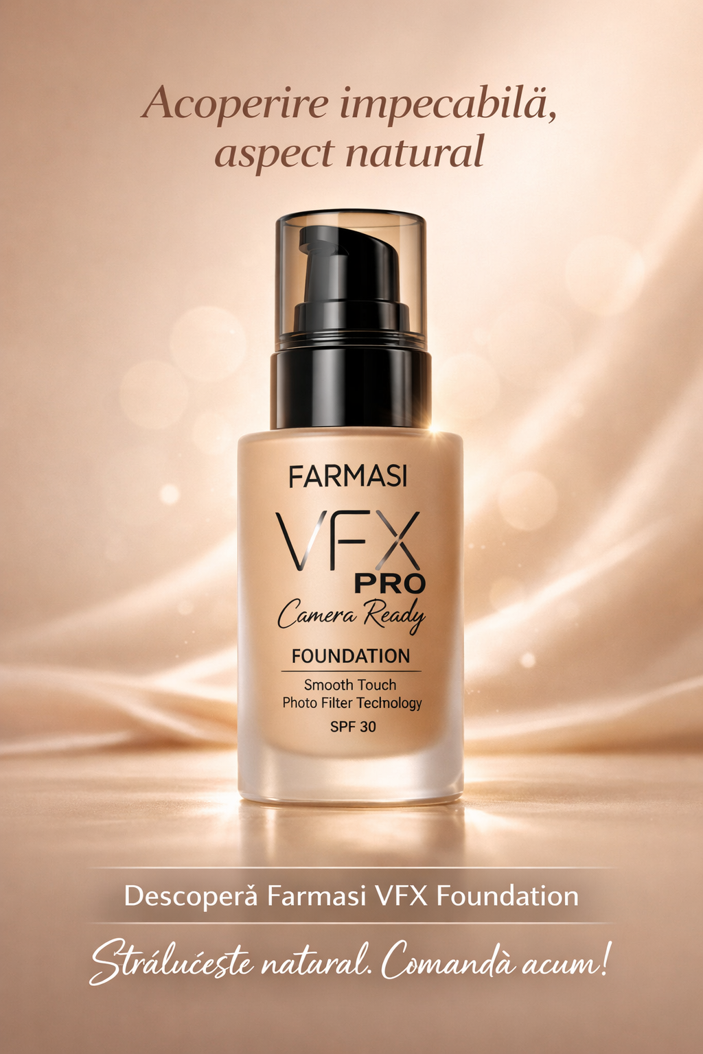 Dragelor, dacă vreți un ten perfect fără filtre (da, chiar și dimineața devreme 😅), am găsit holy grail‑ul fondurilor de ten: VFX Pro Liquid Foundation de la Farmasi! 🪄💄