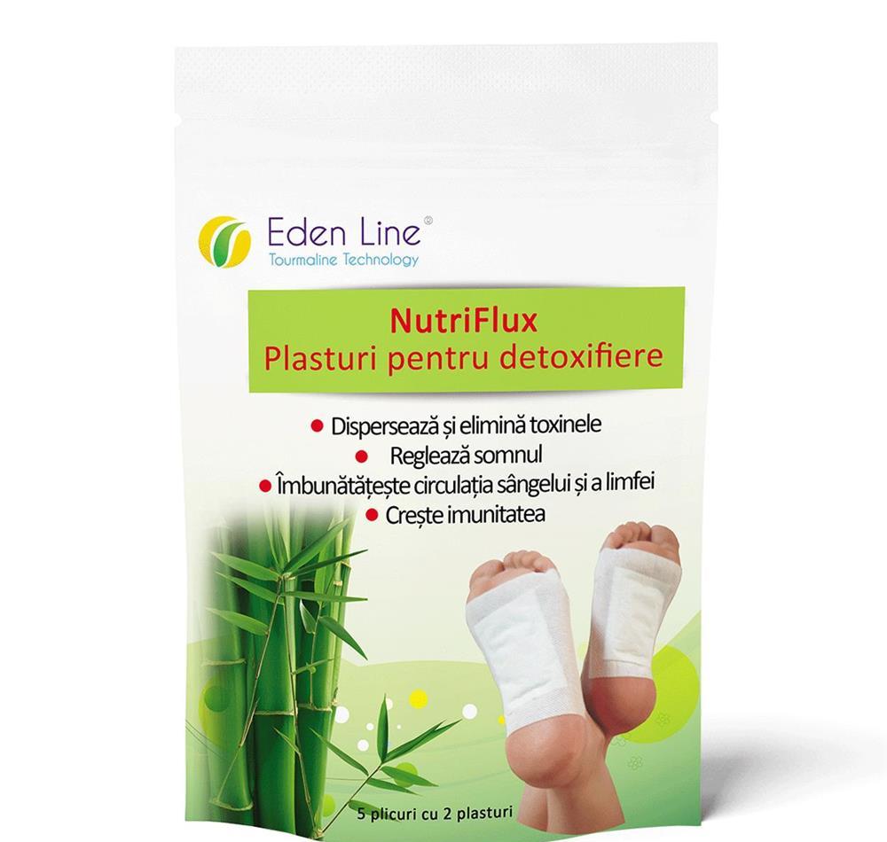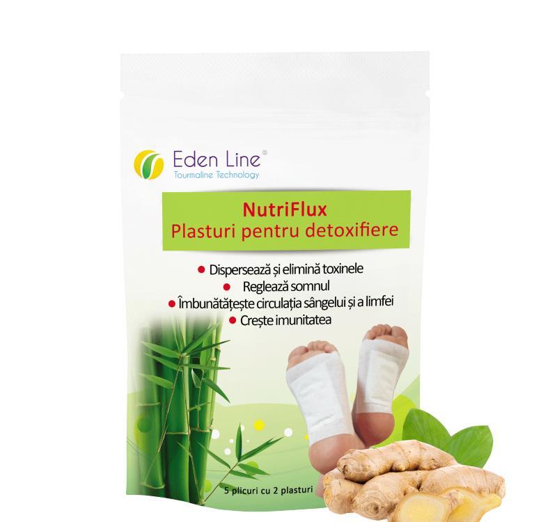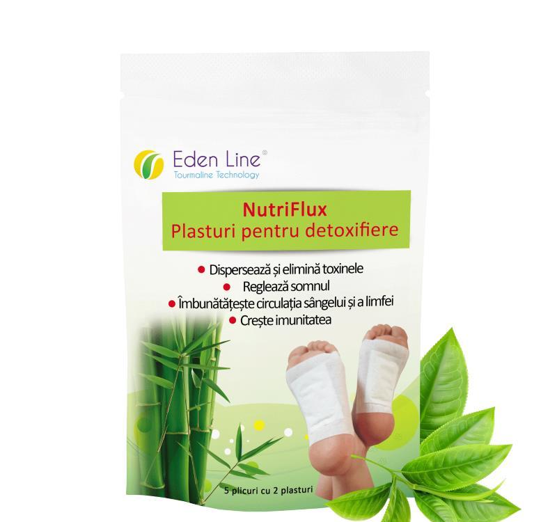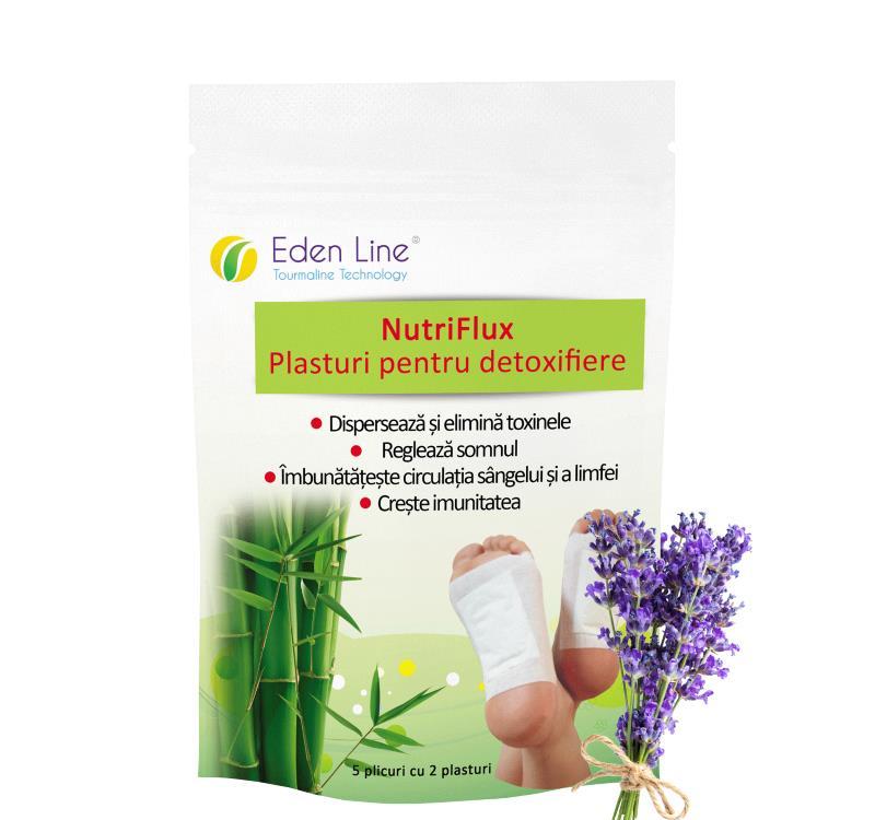 Plasturi pentru detoxifiereRedobândește-ți tonusul și purifică-ți organismul cu plasturii pentru detoxifiere NutriFlux, care valorifică ingrediente naturale ca: oțetul de arbori, siliciul, perlitul, vitamina C, chitosanul și turmalina.Pe lângă formula standard, îți oferim 3 variante de plasturi pentru detoxifiere care conțin plantele tale favorite. Iată-le!-formula orginală + lavandă;-formula standard + ceai verde;-formula standard + ghimbir.Ajută-ți organismul în lupta cu detoxifierea și bucură-te de beneficiile plasturilor NutriFlux:-reglează metabolismul și a tranzitul intestinal;-combat balonarea, flatulența și constipația;-preven acumularea kilogramelor nedorite;-combat tulburările de concentrare, durerile de cap și stările depresive;-normalizează somnul și preven insomniile;-îmbunătățesc circulația sângelui și a limfei.