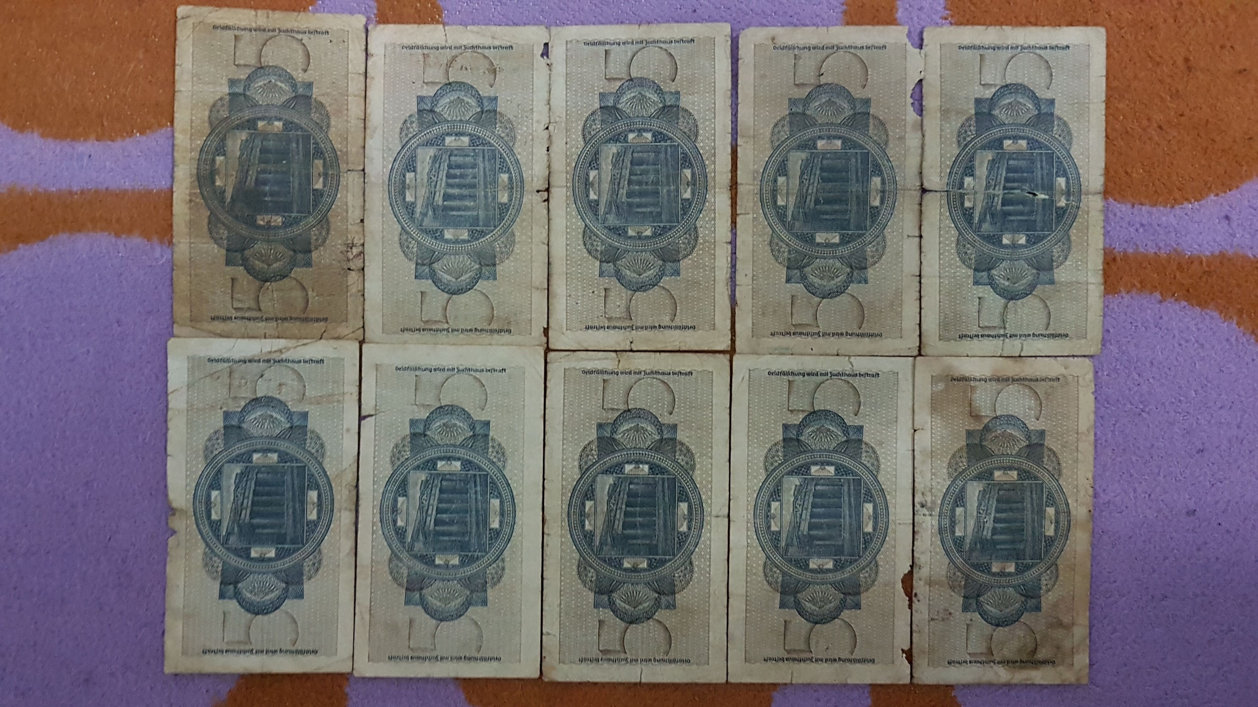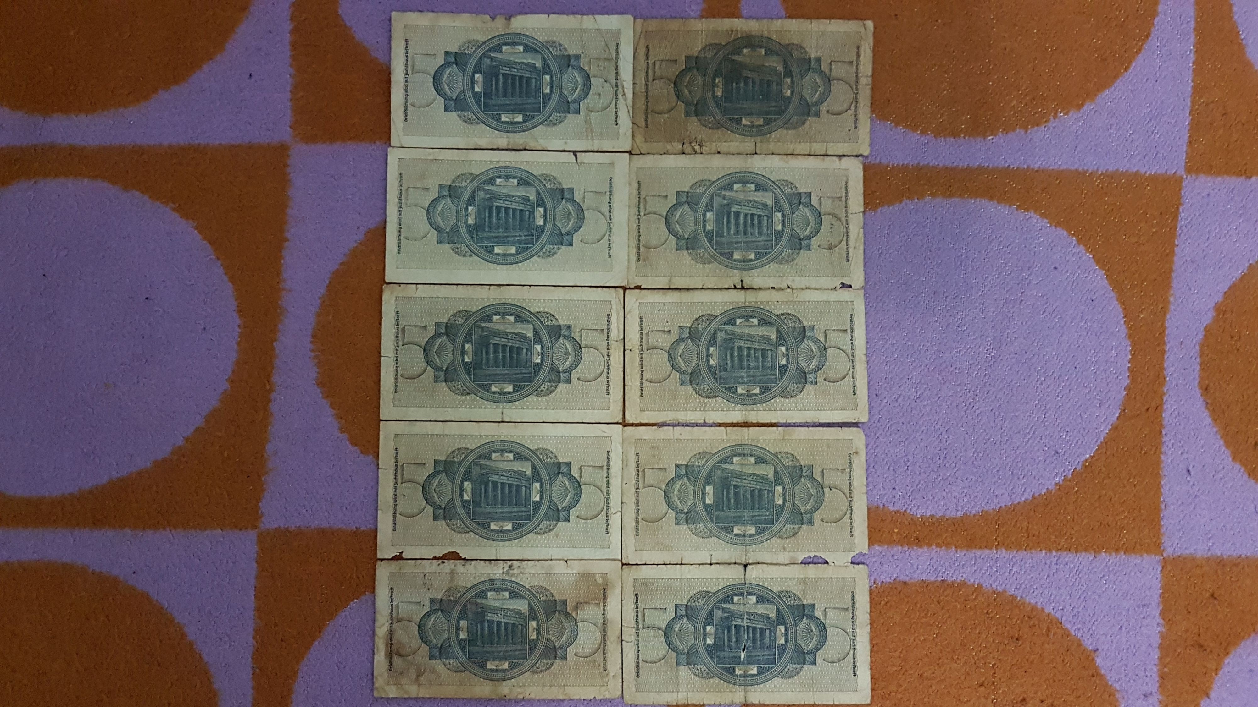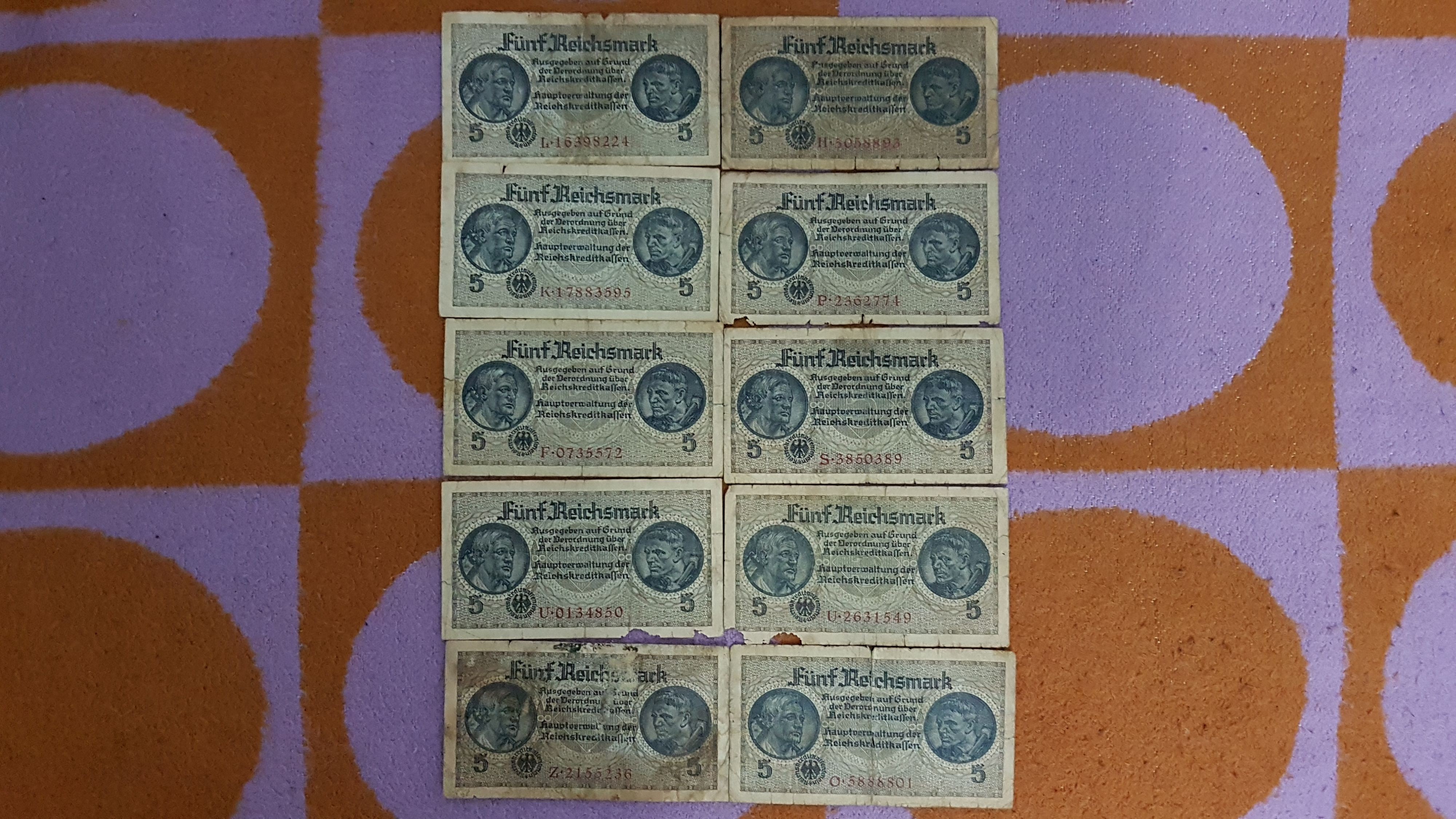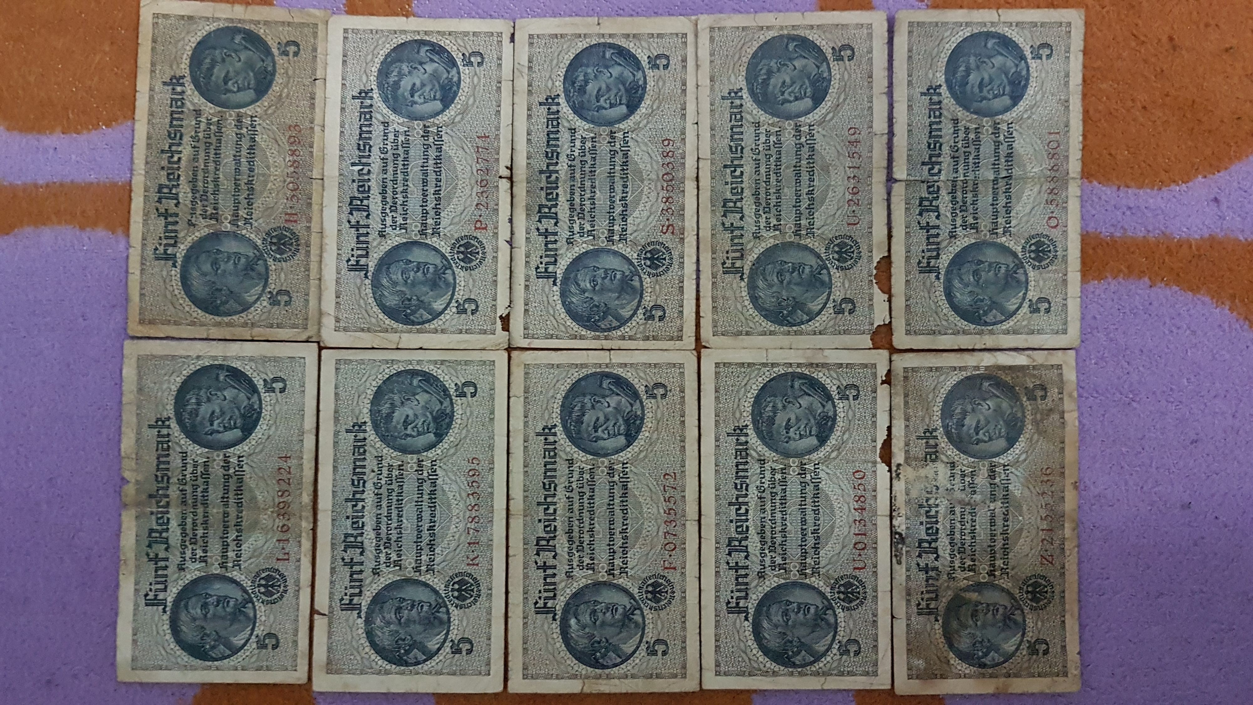 5 Reichmark,fara data,perioada 1939-1944,pt cunoscatori.Detin 10 bucati.Starea lor se poate vedea in poze.Pret=300 lei tot lotul.La bucata pretul difera in functie de starea bancnotei respective.Cer si ofer maxima seriozitate. Va multumesc pentru intelegere!