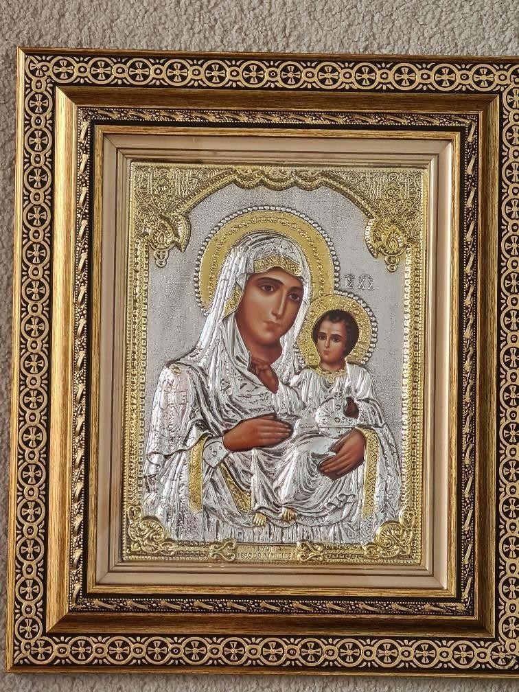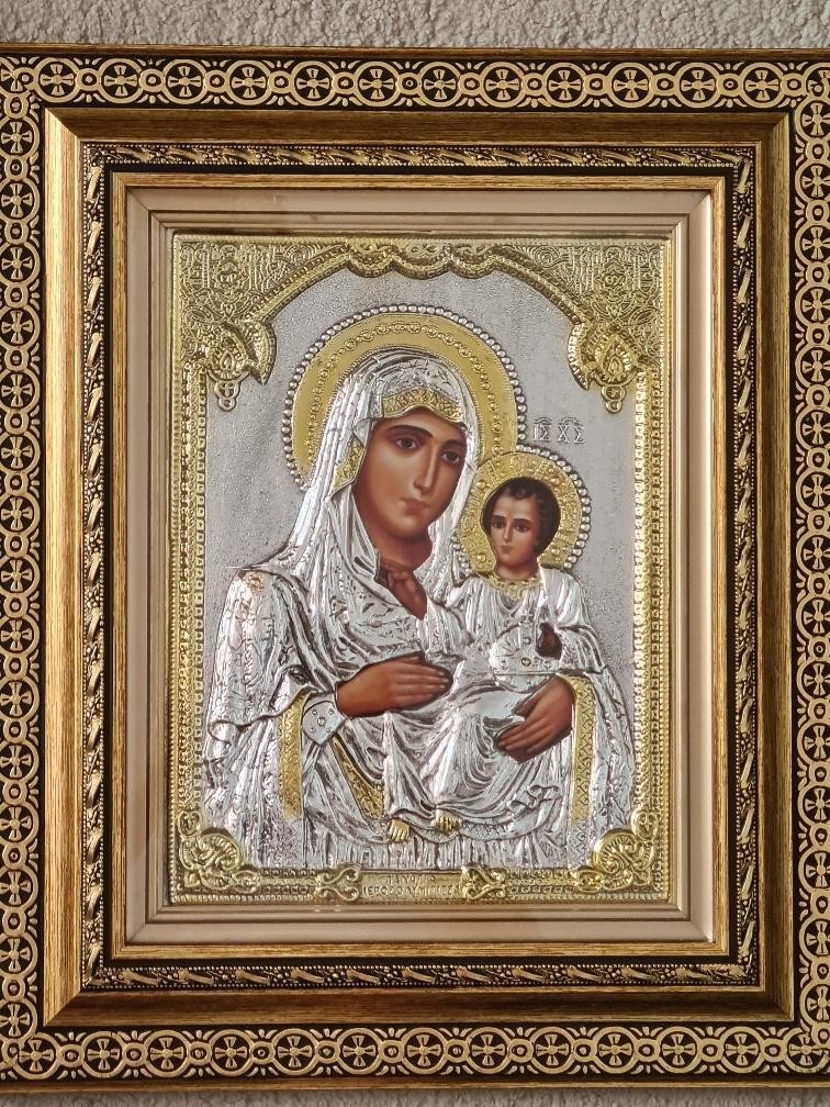 Icoana Argintata,Sfanta Maria cu pruncul ,lucrata manual, cu certificat de autenticitate, cu o superba rama filigranata , sticla de protectie, impact vizual de exceptie. Ideala pentru un cadou deosebit. Dimensiuni :50x40 cm. Livrare prin curier. Executata in Grecia. Dublu rama de lemn Sticla Certificat silver 925 Sistem de prindere pe perete.