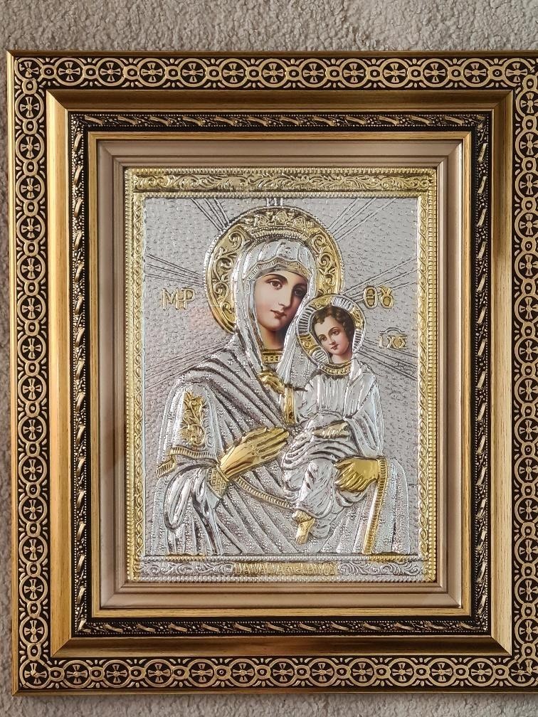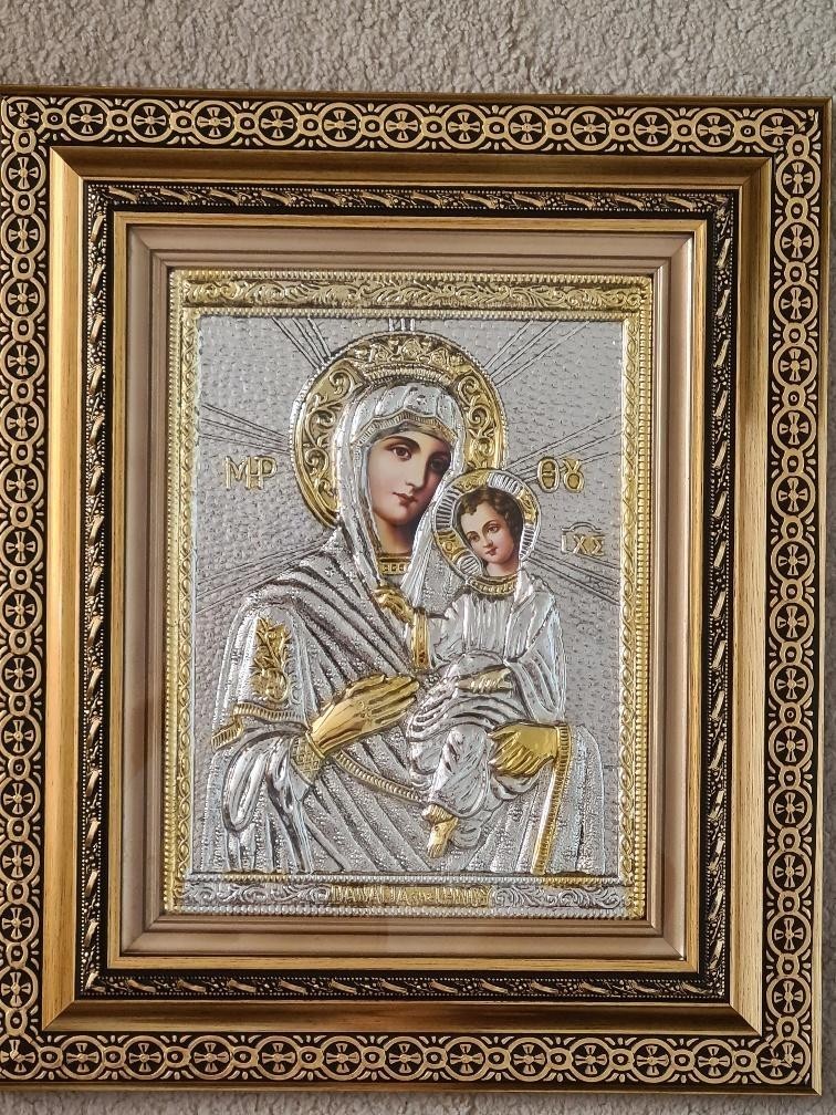 Icoana Argintata,Sfanta Maria cu pruncul ,lucrata manual, cu certificat de autenticitate, cu o superba rama filigranata , sticla de protectie, impact vizual de exceptie. Ideala pentru un cadou deosebit. Dimensiuni :50x40 cm. Livrare prin curier. Executata in Grecia. Dublu rama de lemn Sticla Certificat silver 925 Sistem de prindere pe perete.