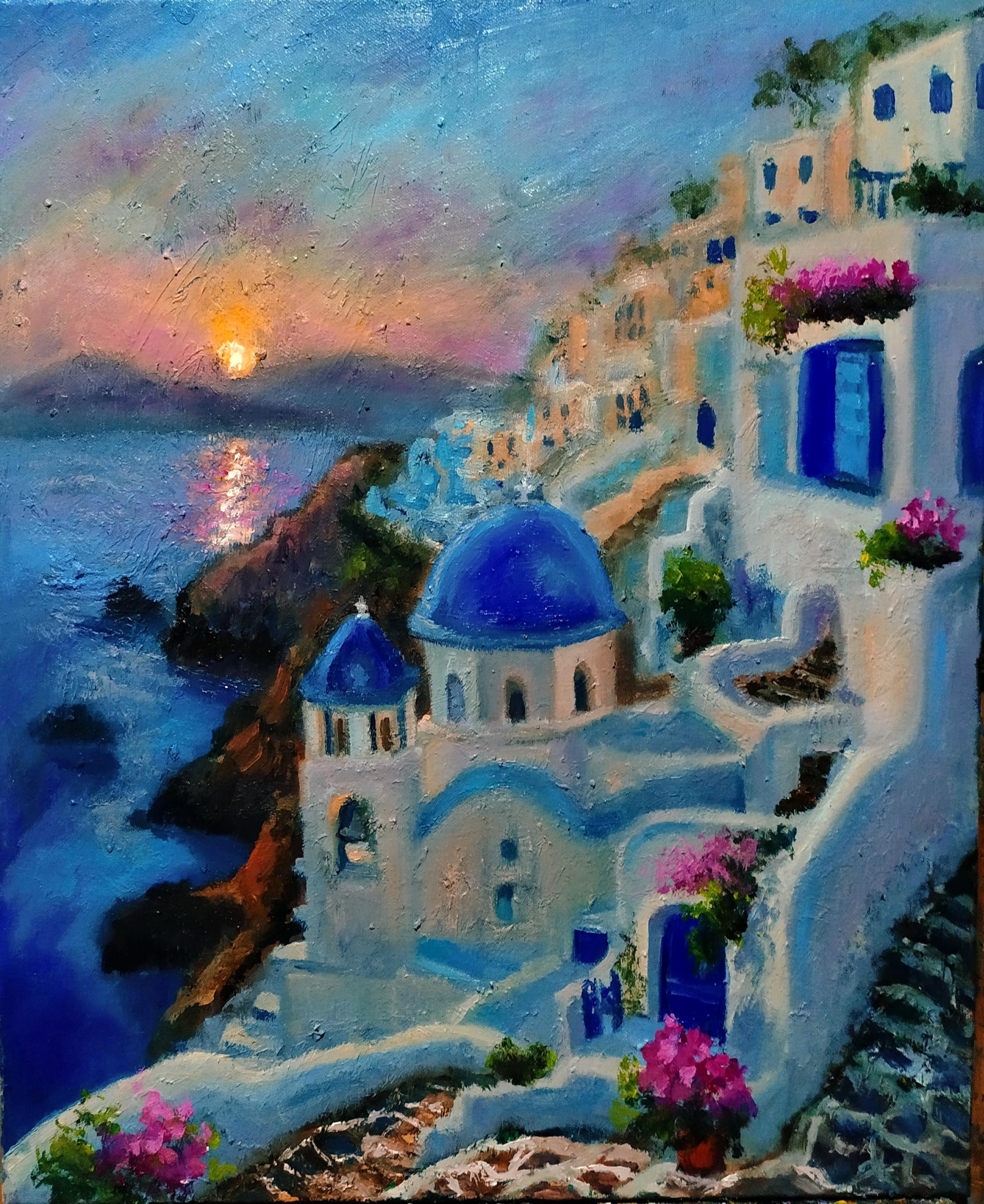 Te invit să te pierzi în liniștea serii mediteraneene, unde soarele atinge marea, iar casele albe cu ferestre albastre îmbracă stâncile în culori calde.