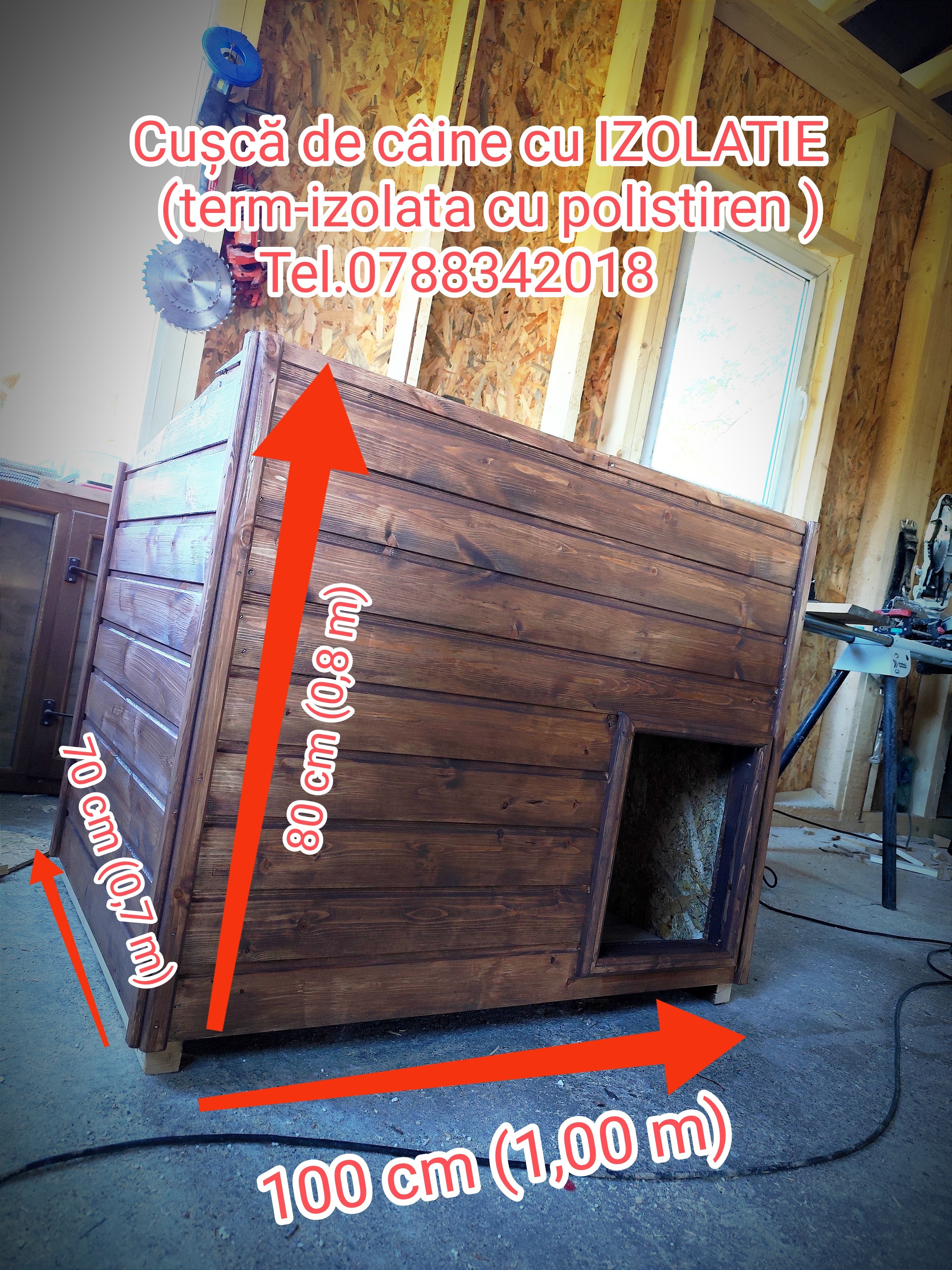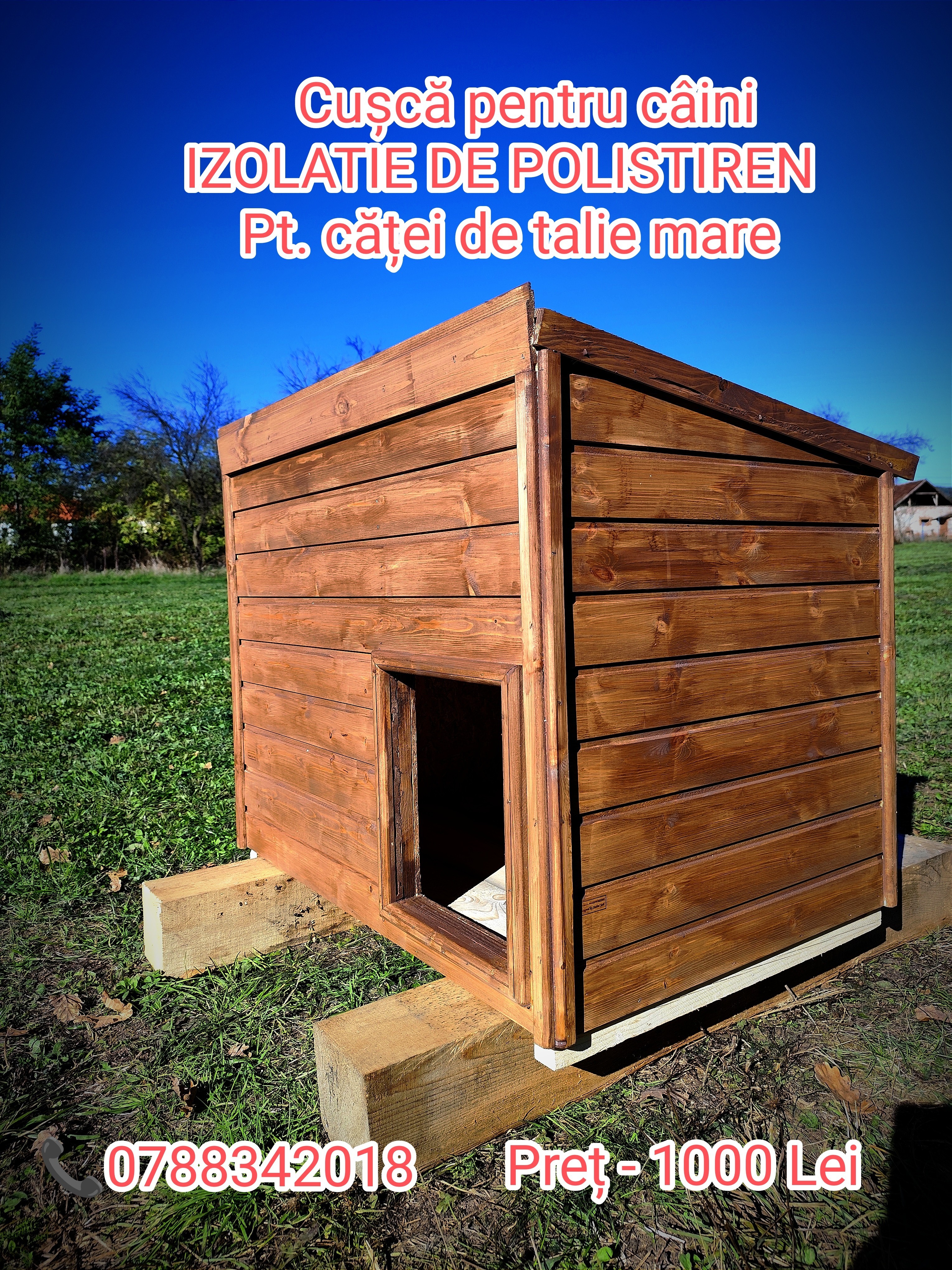 Exemplu, pt un cățel de talie mare, (Ciobanesc, Labrador, Cane Corso, etc) este necesară o dimensiune a cuștii de L-1,00m x 0,70m x H0,80m pt un raport de protejare eficienta fata de volumului de aer in cusca și nivelul de izolatie al pereților. Pret- 1000 lei la aceste dimensiuni cu acoperiș într-o apă.