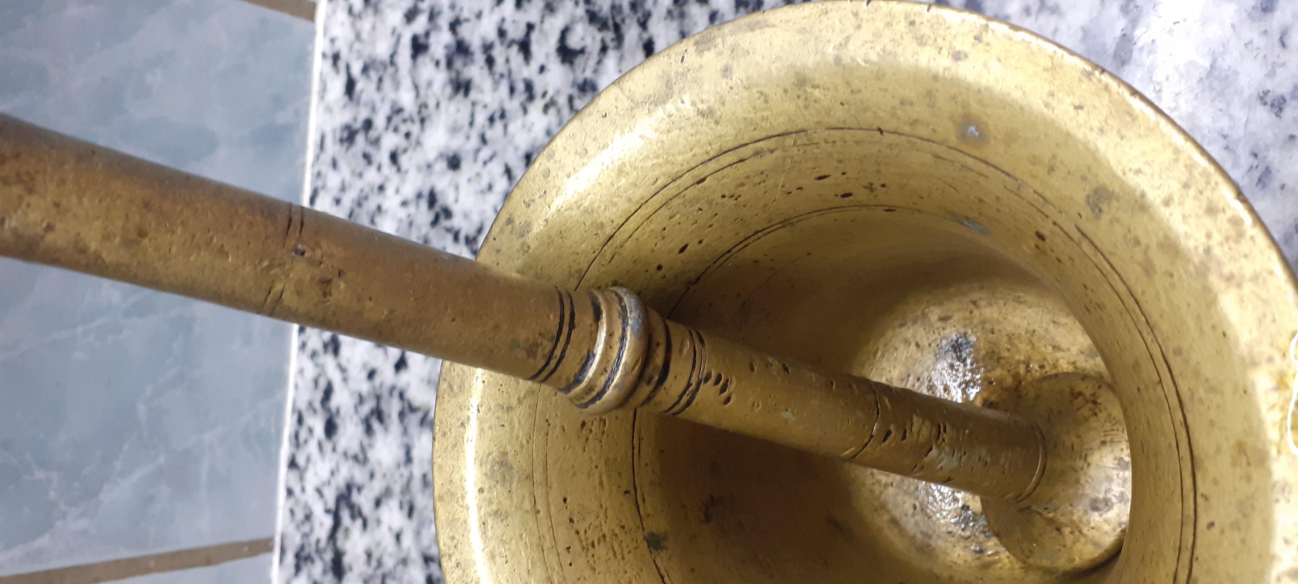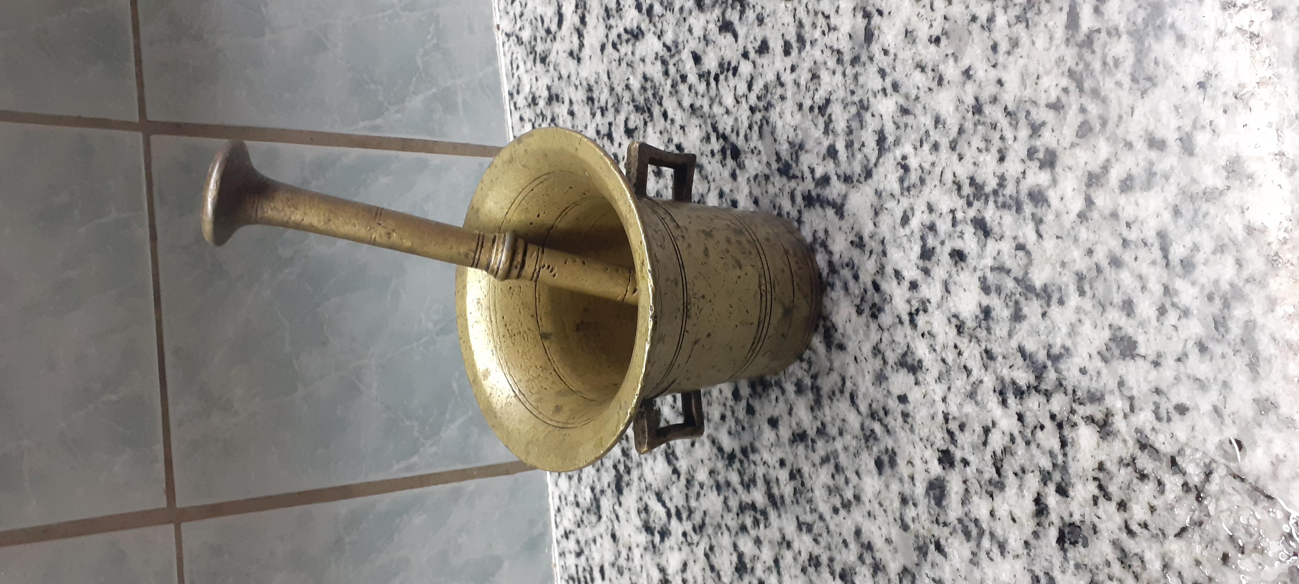 Piulita/ mojar veche/ vechi din bronz masiv cu diametru superior= 14,5 cm, diametrul inferior= 8 cm, inaltimea =14 cm si pistil (pisalog) din bronz masiv (L= 25 cm) cu o vechime de peste 75 de ani si cu patina accentuata si bine aspectata. Pret= 200 lei