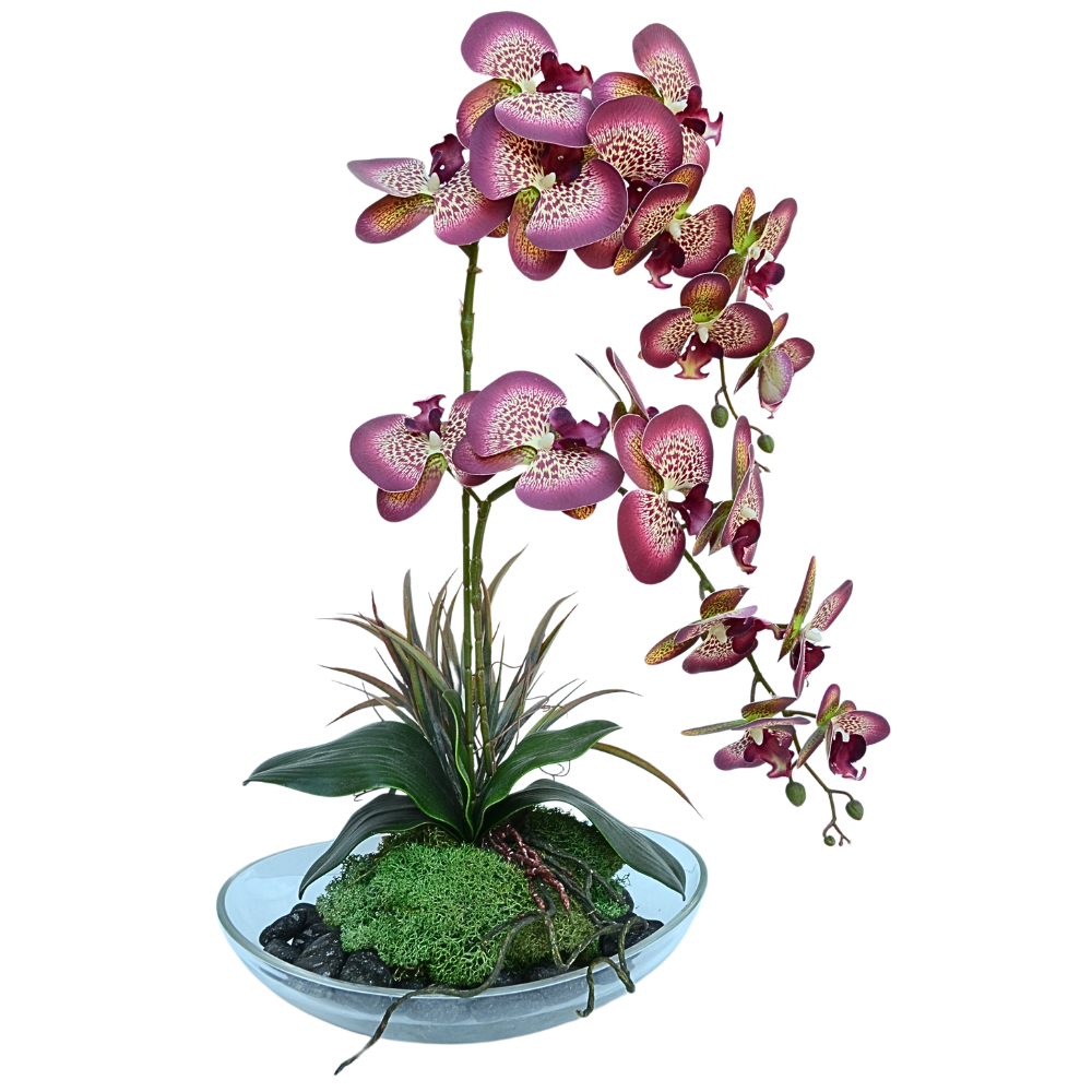 Acest aranjament floral unic este creat cu ceea mai mare atenție la detalii și fabricat din materiale de calitate superioară, in armonie cu orhideele artificiale tigrate, cu frunze decorative, radacini aierene si muschi natural, pietre decorative care introduse la baza aduc un element de prospetime si aspect organic . Aranjate cu atentie in vaza de sticla au o viziune realistă si imita perfect orhideele naturale. Orhideea se incadreaza foarte bine ca design interior elegant pentru birou sau camera de zi.