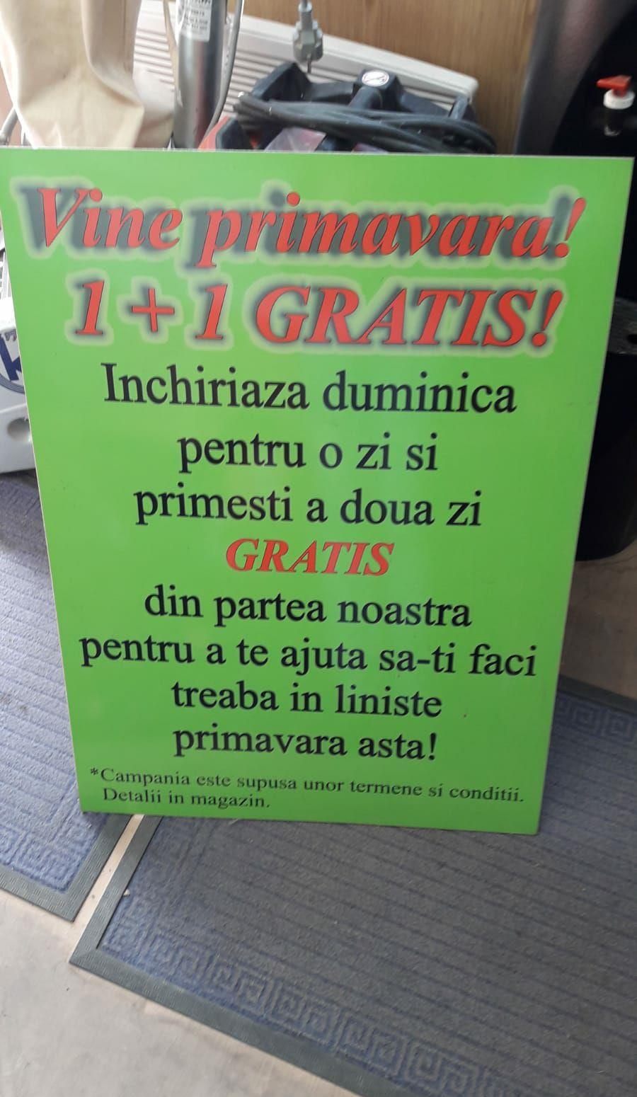 1+1 GRATISInchiriaza duminica pentru o zi si primesti ziua de luni GRATISdin partea noastra pentru a te ajuta sa iti faci treaba efficient , rapid si sigur.Inchiriere simpla fara plata garantiei