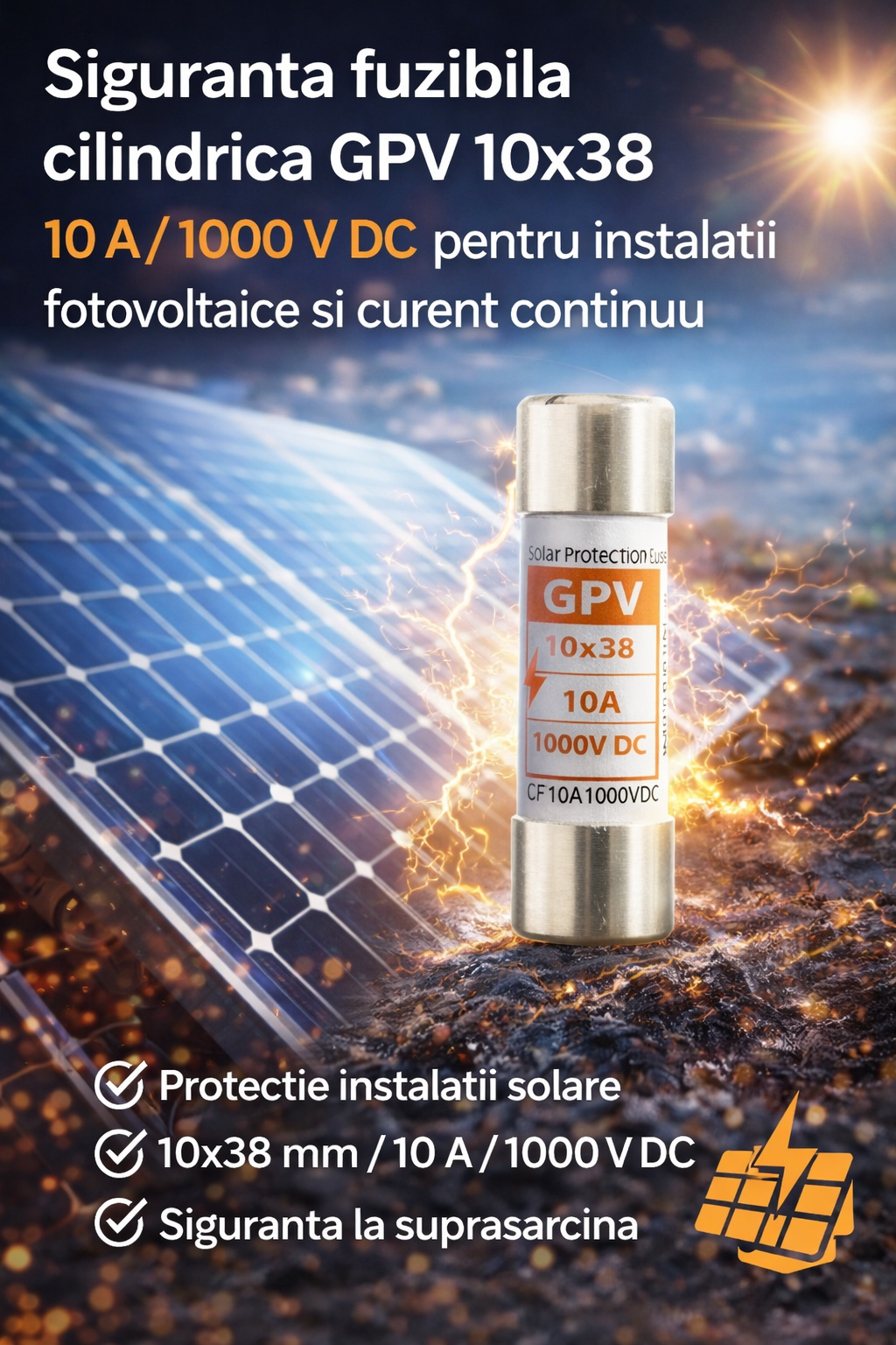 Siguranta fuzibila cilindrica GPV 10x38 – 10 A / 1000 V DC este componenta electrica esentiala pentru protectia instalatiilor fotovoltaice, panourilor solare si a circuitelor de curent continuu de inalta tensiune. Conceputa pentru a intrerupe in mod sigur fluxul de curent in situatii de suprasarcina sau scurt-circuit, aceasta siguranta fuzibila protejeaza echipamentele si cablurile impotriva deteriorarii costisitoare.
