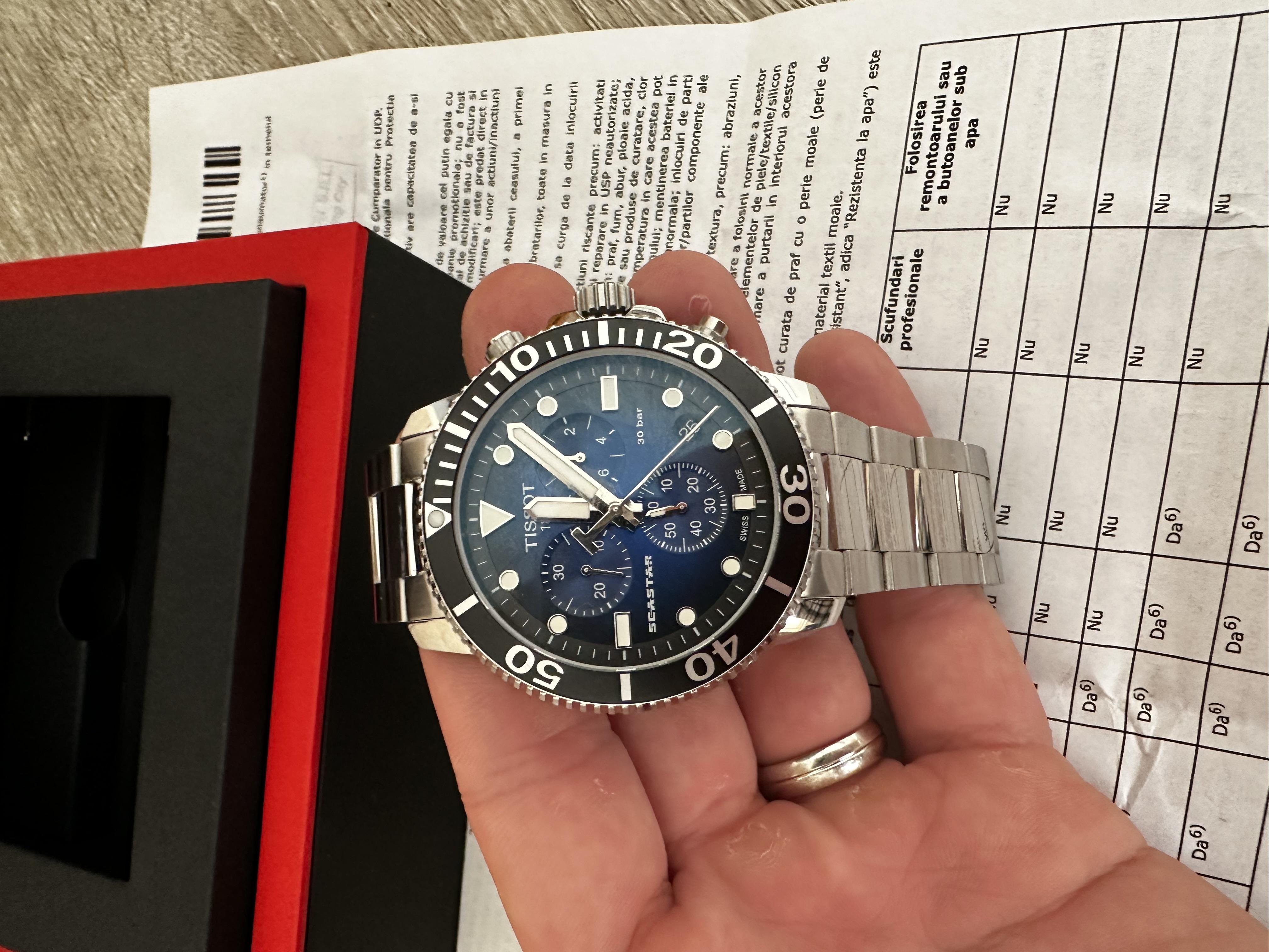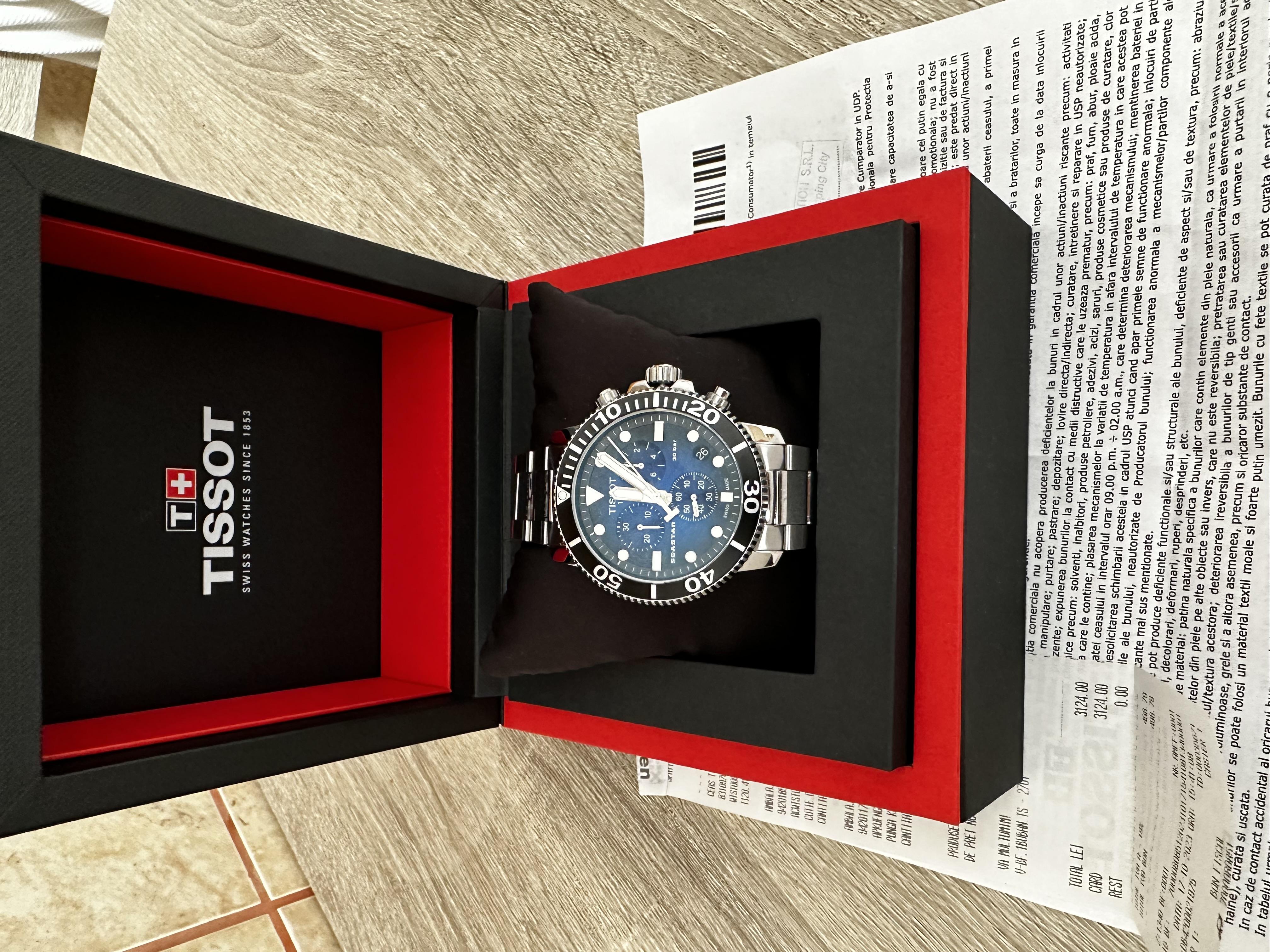 Vand ceas Tissot, achizitionat in luna Octombrie. A fost folosit foarte putin, functioneaza si arata ca nou. Are garantie. Poate fi verificat la reprezentata dupa serie. Pretul este 3000 de lei usor negociabil. Nu ma intereseaza schmburi.