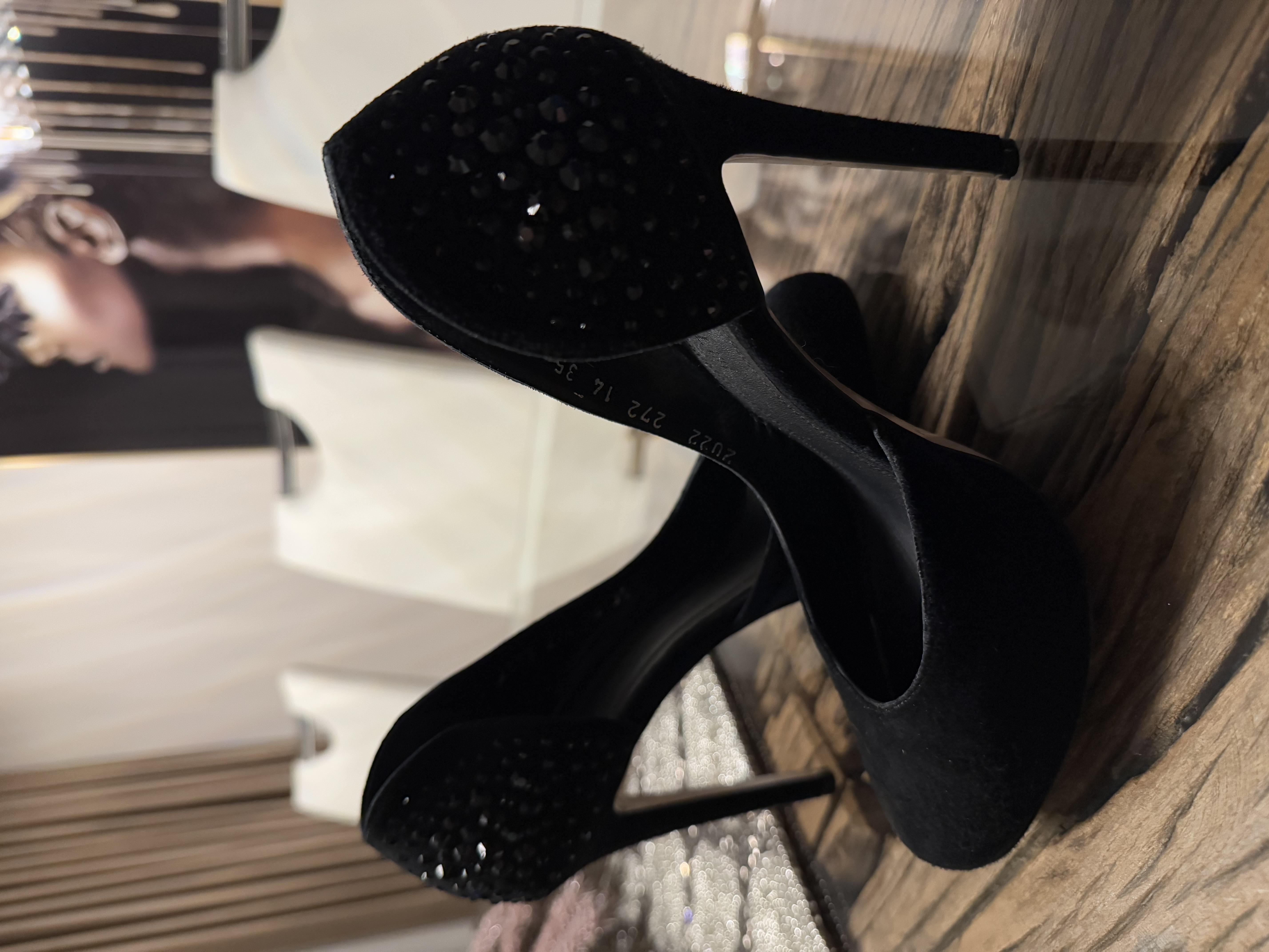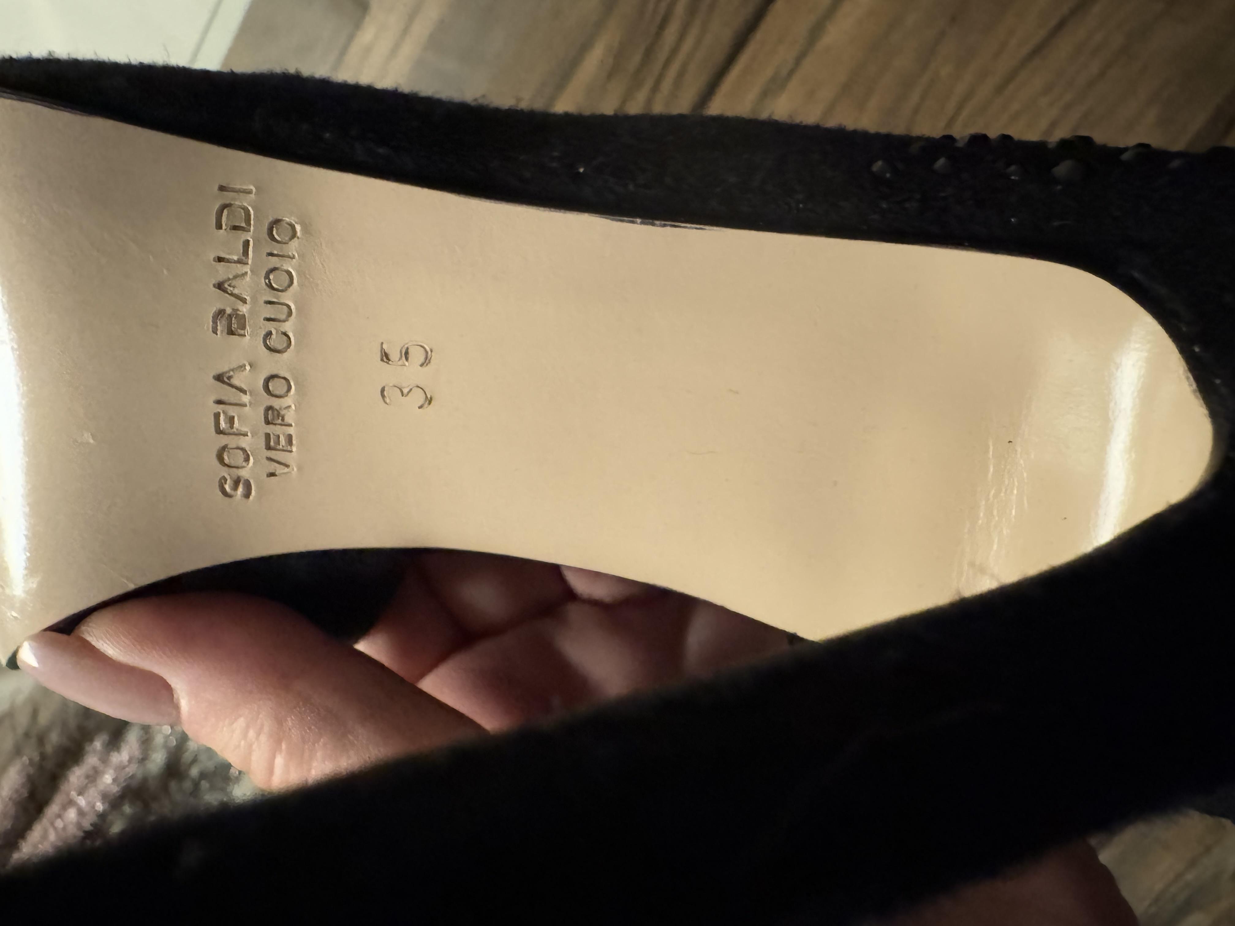 Vând pantofi Sofia Baldi, mărimea 35, din piele întoarsă, stare excelentă, decupați , cu cristale negre pe partea din spate . Rafinați și eleganți, pantofii sunt absolut superbi.