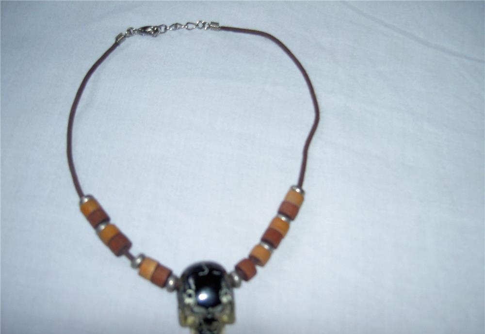 colier cu un pantantiv din plastic in forma de cap de mort,din sfoara cerata cu margele din lemn si metal,lungime totala 39cm,nu este nou dar in stare buna