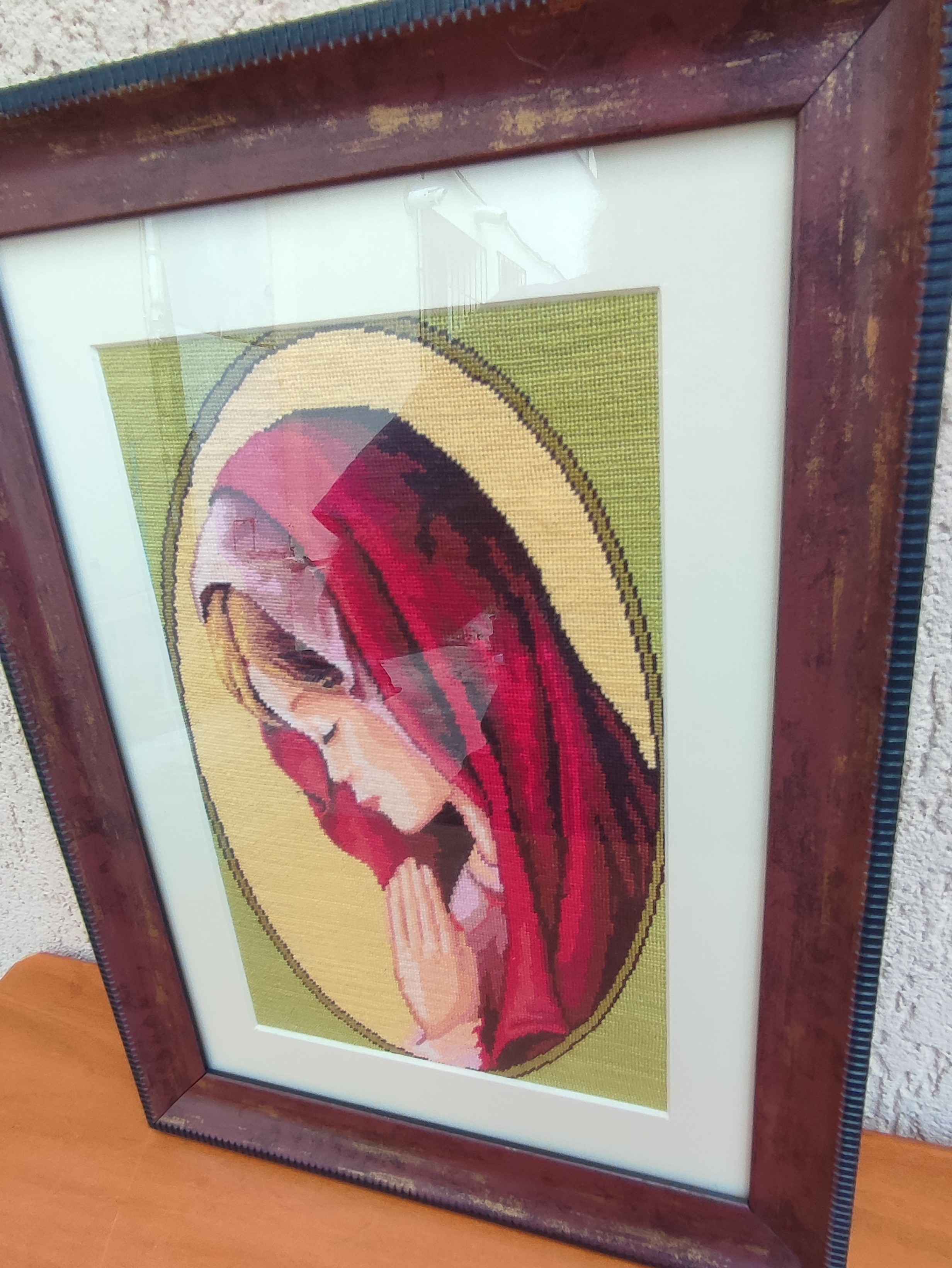 Vând goblen vintage cu pas mic confecționat artizanal, având ca model pe fecioara Maria rugându-se cu mâinile împreunate, acoperită de un vestmânt roșu. Goblenul este protejat de un geam de sticlă și are o frumoasă ramă din lemn decorata cu auriu.