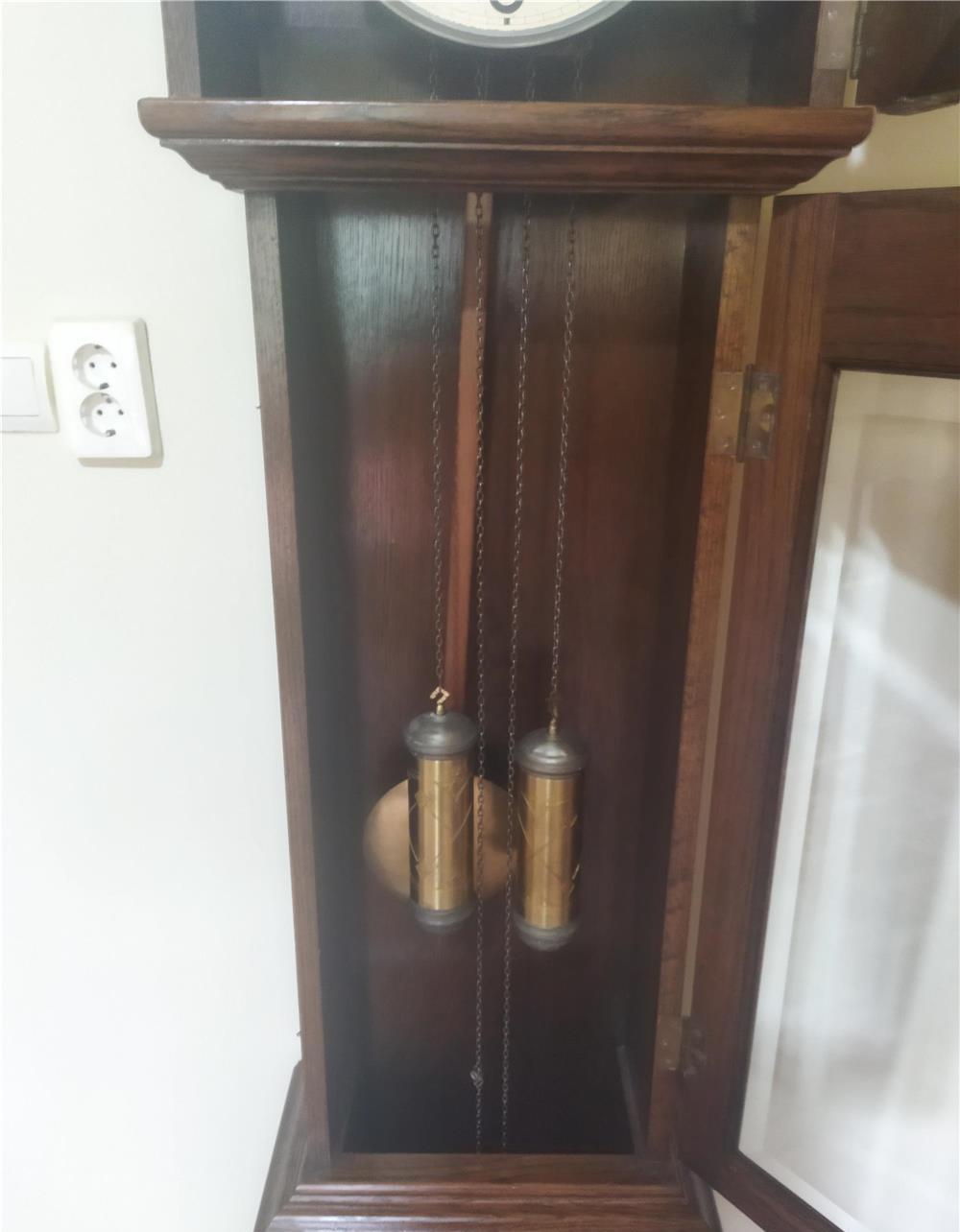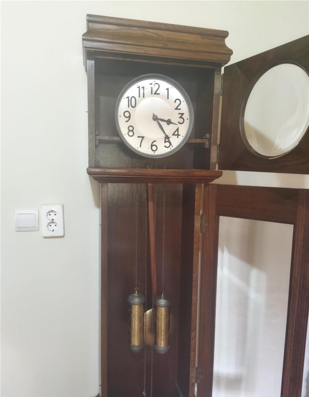 Ceas de podea cu pendul Junghans în stare foarte bună de funcționare mecanism curățat și uns, suna la jumate și fix bătaie pe arc, cutie lemn masiv fara carii sau defecte cu sticla cristal