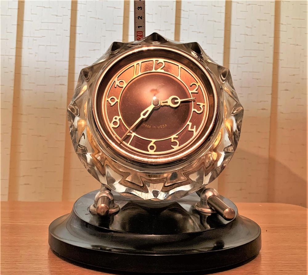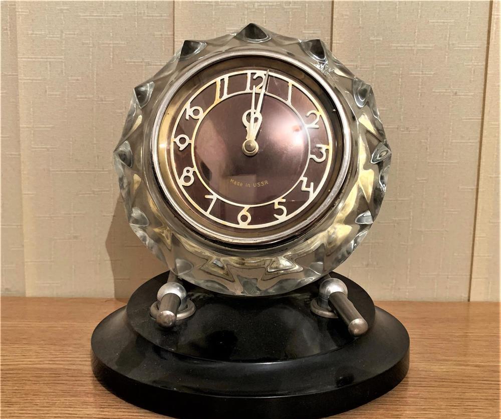 Ceas mecanic de șemineu vintage MAJAK, vechi de cel puțin 50 de ani, made in URSS. Ceasul e montat în cristal, se poate /pune regla în diverse poziții și se întoarce o data la o saptămână. Ceasul se prezintă bine din punct de vedere estetic, funcționează, dar trebuie zgâlțâit de el de câteva ori, ca să pornească, deci e clar că are oarece probleme. Dimensiuni: 15 cm lățime și 20 cm înălțime (care e reglabilă).Preț: 300 lei + taxa de curierat și ramburs (atenție, e masiv, având 1,95 Kg!).Telefon: