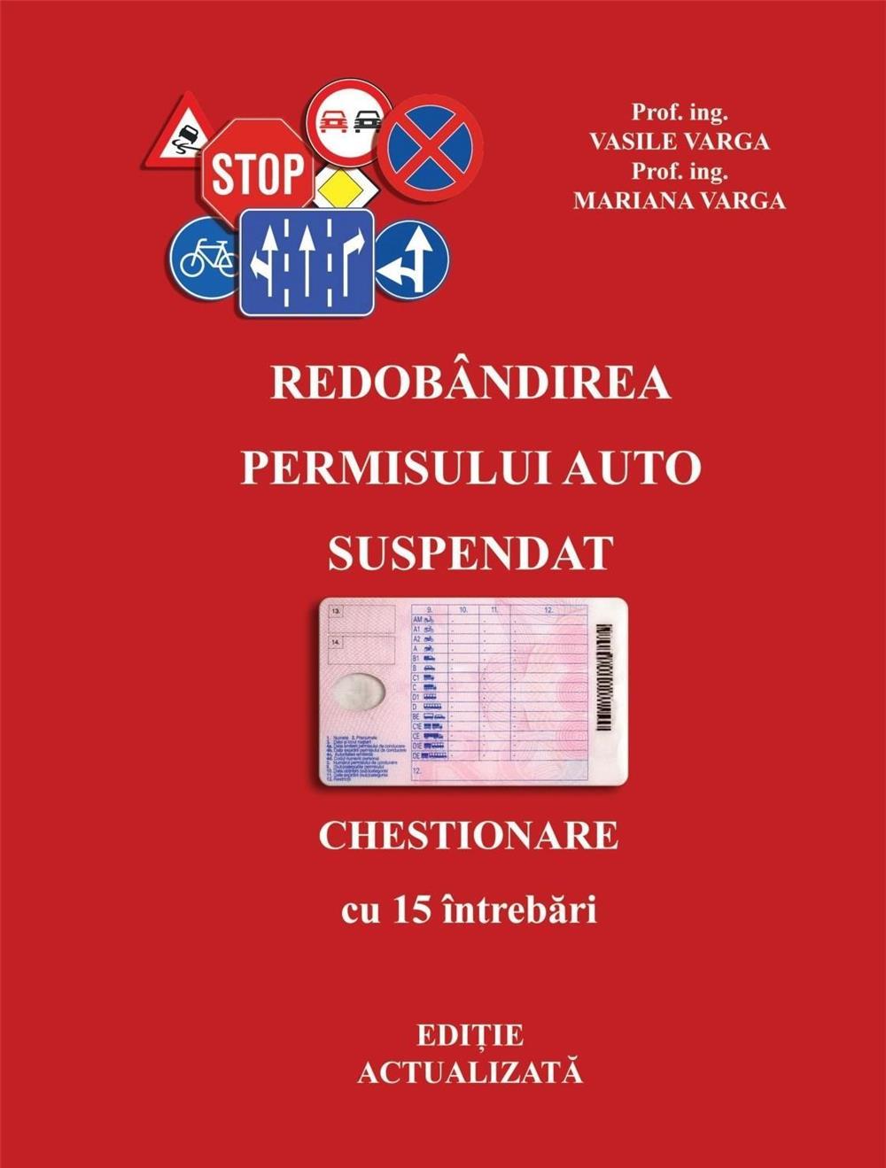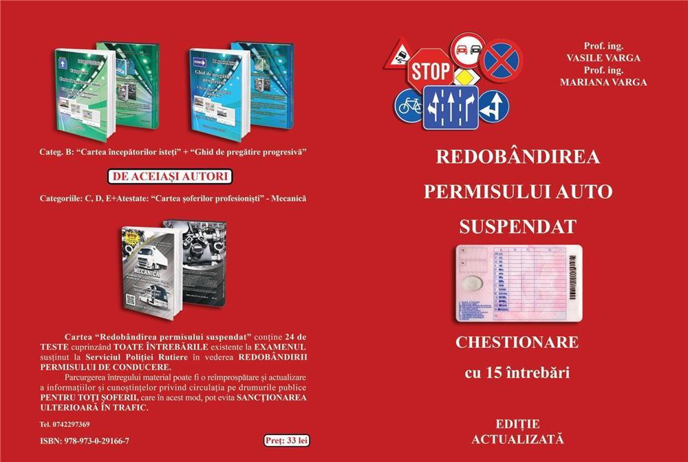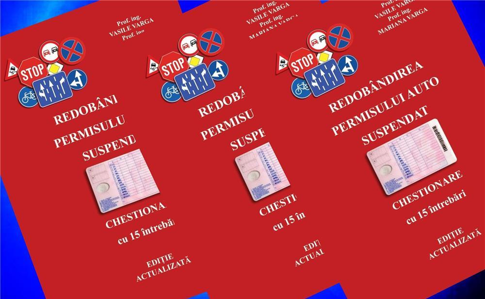Considerăm necesară apariția acestei CĂRȚI în care găsiți prezentarea modului în care un conducător auto al cărui permis a fost suspendat în urma unei contravenții, poate obține reducerea perioadei de suspendare. Din Legislația rutieră sunt selectate doar noțiunile strict necesare reîmprospătării cunoștințelor dobândite și rezolvării CHESTIONARELOR prezente la EXAMEN.Dacă vi s-a suspendat dreptul de a conduce pe o perioadă de 60 sau 90 de zile, puteți solicita reducerea perioadei de suspendare aplicată, dacă îndepliniți cumulativ următoarele condiții, conform Art. 221 (1) din Regulamentul de aplicare a O.U.G. nr. 195/2002:a) ați fost declarat admis la testul de cunoaștere a regulilor de circulație;b) aveți vechime în conducere cel puțin un an înaintea săvârșirii faptei;c) în ultimii 3 ani de la data săvârșirii faptei pentru care solicitați reducerea suspendării nu ați beneficiat de o altă reducere a perioadei de suspendare;d) în ultimii 2 ani de la data constatării faptei nu ați avut suspendat dreptul de a conduce.Testarea constă în rezolvarea unui CHESTIONAR format din 15 întrebări din Legislația Rutieră. Pentru promovare vă trebuie 13 răspunsuri corecte. SUCCES!