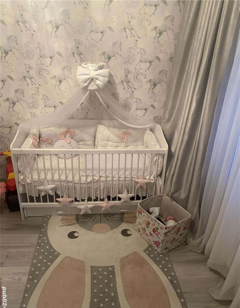 Produsele se prezintă in stare foarte buna, copilul nostru nu a dormit niciodată in camera sa . Se pot viziona in București . Întregul dormitor a fost achizițonat din fostul magazin Kika Dulăpiorul : 2 uși, cu aerisire, lungime 61cm lățime 109cm înălțime 206.Comoda : 3 sertare cu separatoare in 2 din cele 3 sertare, adâncime 49cm, lățime 73cm, înălțime 80 cmEtajera : lungime 75cm, lățime 22cm, înălțime 29 cmPățut cu lada de depozitare inclusă : lungime 146 cm, lățime 78 cm, înălțime 92,5 cm .Saltea bambus Magniflex : 140X70Masa înfasat : 93x54x82 cm Covor copii : 120x170Ofer cadou lenjeria+baldachinul