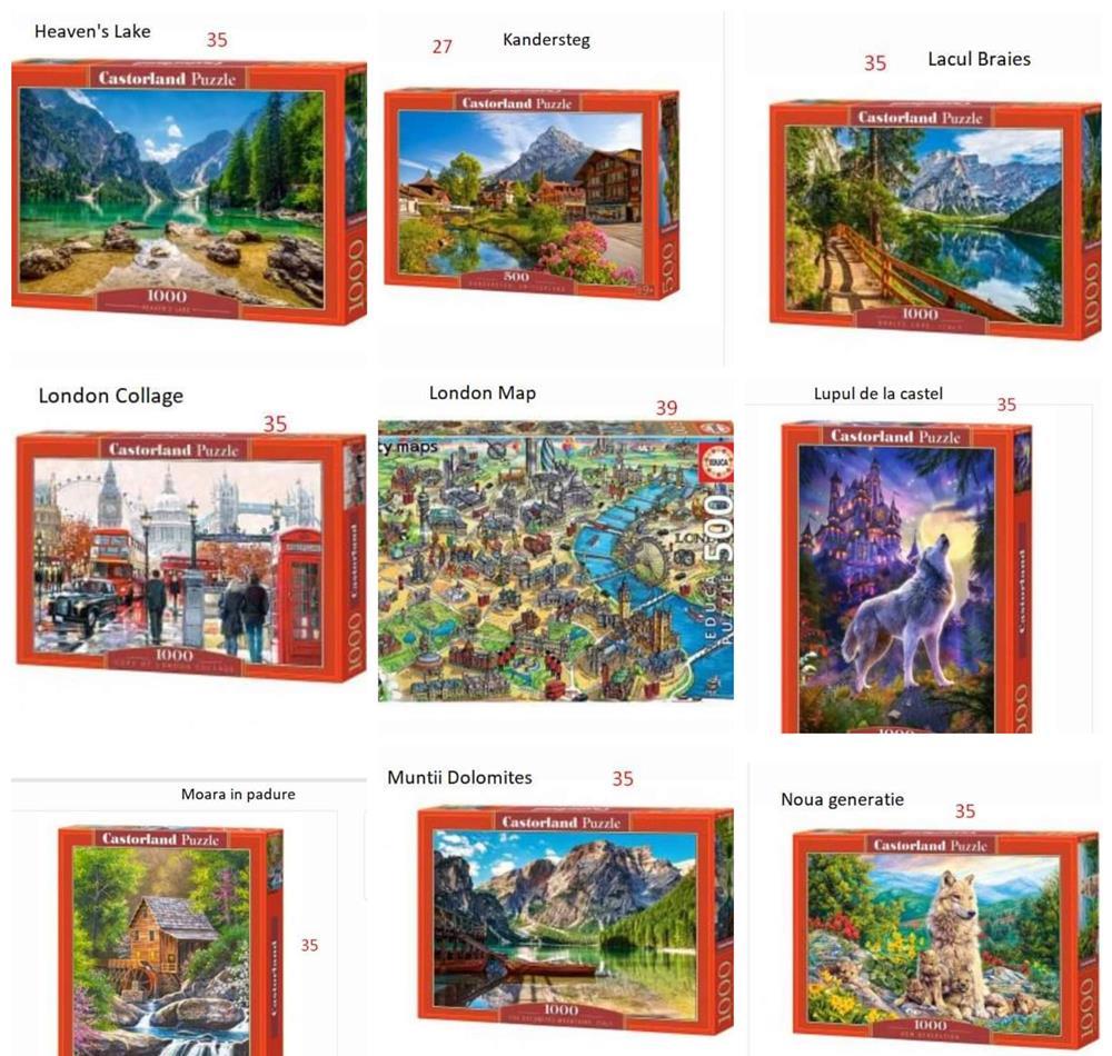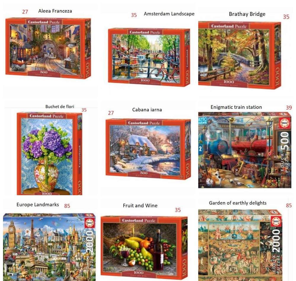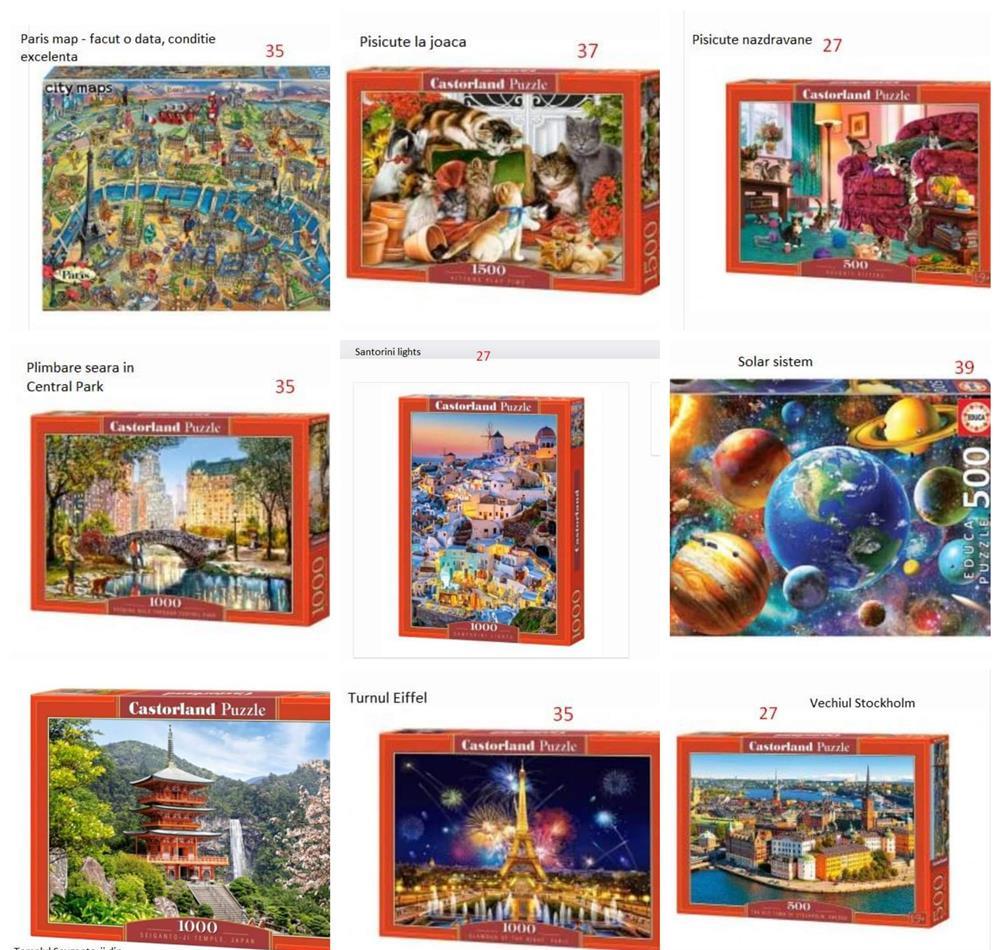 Toate cele 28 puzzle-uri, in afara de unul, care a fost facut o singura data (Paris Map), sunt noi si sigilate. Pretul si numele fiecaruia este trecut pe poza.Pachet toate puzzleurile: 1000 ronPlata se face in avans in cont.Predare personala in Bucuresti sau prin curier in tara (costul transportului este suportat de cumparator).Happy puzzling! Publi24_1648131226 07xx xxx xxx Arata telefon