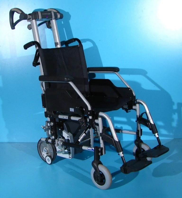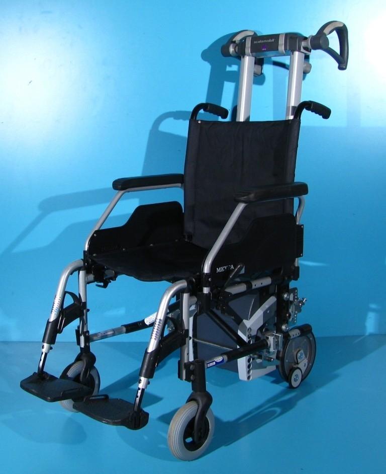 Deplasarea in sus si jos se face cu ajutorul unui motor electric. In timpul deplasarii pe scari, rotile mari ale scaunului cu rotile trebuie detasate.