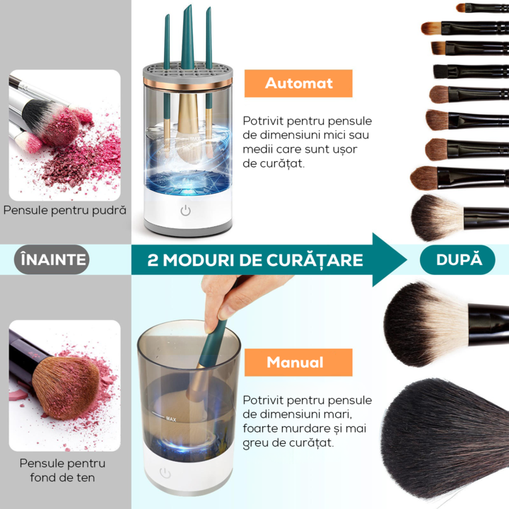 Ideal pentru acasă sau salon: Fie că ești un profesionist în machiaj sau pur și simplu îți dorești pensule impecabile, acest dispozitiv este alegerea ideală. Ușor de folosit și extrem de eficient, îți va facilita rutina de curățare a pensulelor, ajutându-te să economisești timp și să păstrezi un standard înalt de igienă.