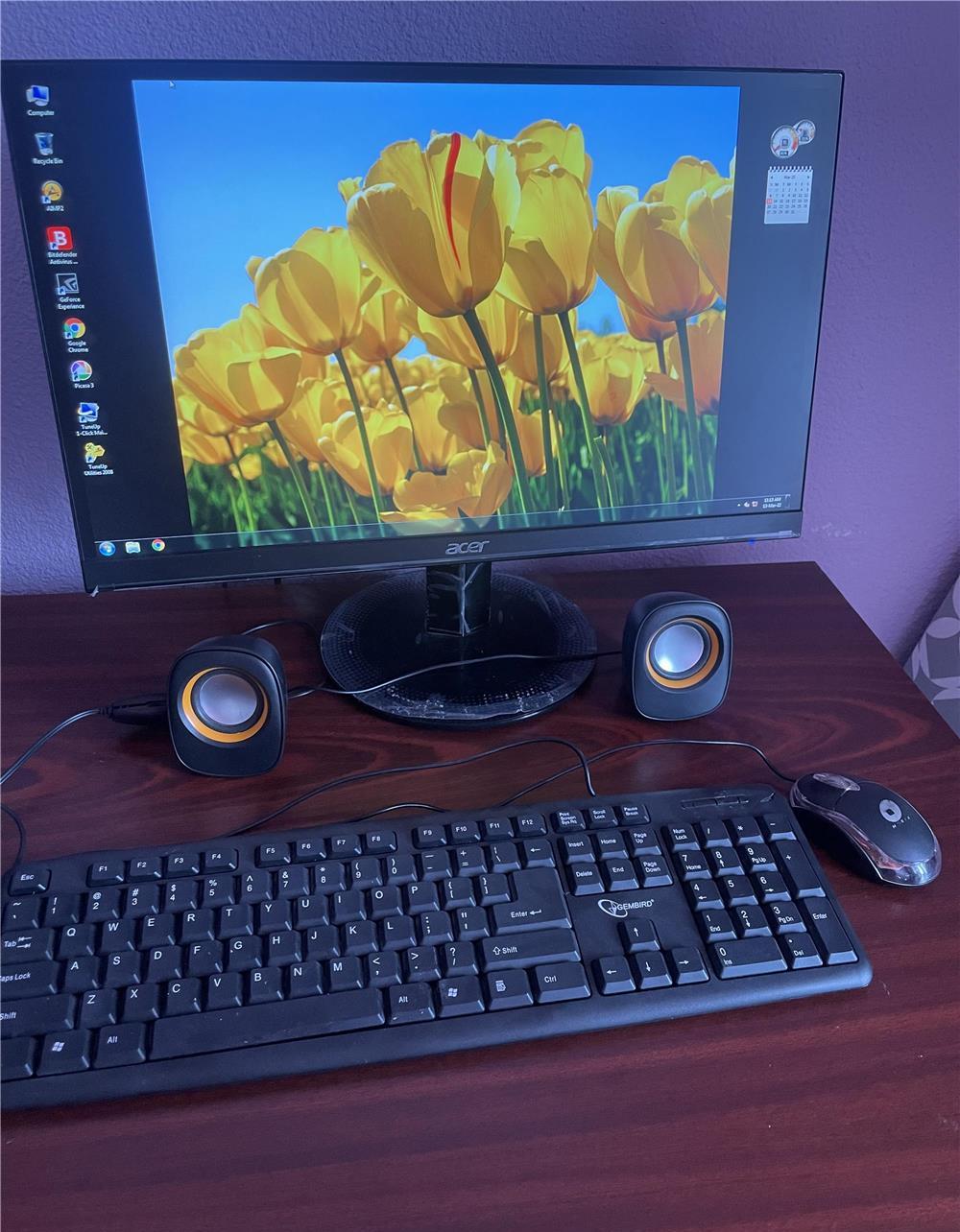Caracteristici PC de vanzare:(699 lei, negociabil)1) Unitate centrala (culoare neagra):- design modern cu carcasa transparenta si cu interior luminat de leduri albastre;- achizitionat in ;- Windows 7 Ultimate SP1-64 bit;- procesor: Intel Core i5-4570 CPU 3.20GHz;- memorie RAM: 8.00 GB;- memorie Hard: Seagate Barracuda 7200 de 500GB;- placa video: NVIDIA GeForce GT 710;- DVD RW;- mufe USB 2.0: 2 pe fata si 4 pe spate;- mufe USB 3.0: 1 pe fata si 2 pe spate;- 1 mufa HDMI (spate);- 2 mufe DVI (spate);- 2 mufe VGA (spate);- 1 mufa Ethernet (spate);- 1 mufa mouse pe spate si 1 mufa tastatura pe spate;- mufe jack pentru boxe, casti si microfon (fata+spate);2) Monitor (culoare neagra):- ACER SA220Q bid LCD Monitor;- Led backlight technology;- diagonala de 23 inchi;- data fabricatiei: decembrie 2017;- mufe (spate): 1*VGA, 1*DVI, 1*HDMI;3) Tastatura si mouse (culoare neagra);4) Boxe externe (culoare neagra) - 2 bucati;