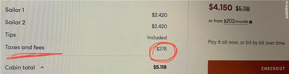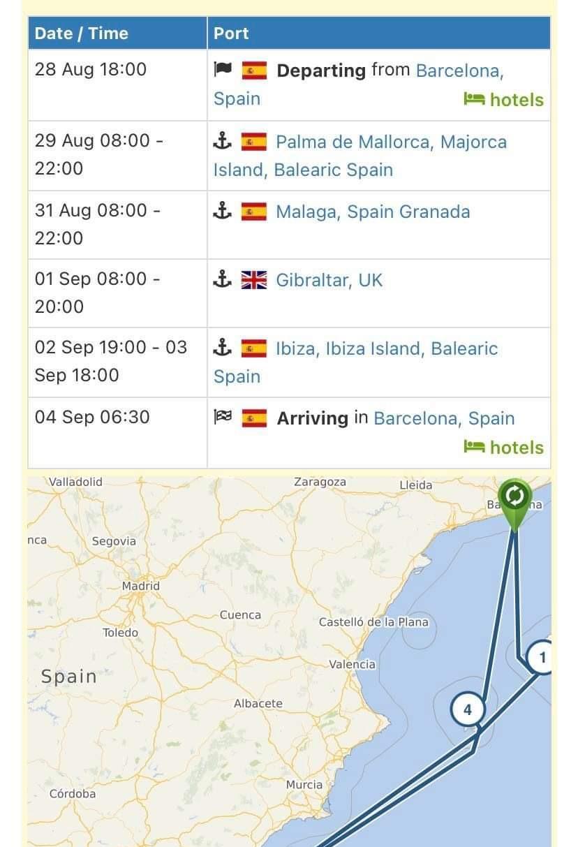 Vând croazieră, o cameră cu terasă pentru 2 adulți 18+, mese incluse, tips inclus, preț 4300 lei (pentru 2 persoane), perioadă la alegere până la sfârșitul lunii septembrie (Palma de Mallorca-Malaga-Gibraltar-Ibiza / Toulon-Carrara Italia-Ajaccio Corsica-Cagliari Sardinia-Ibiza / Marseille-Cannes-Olbia Sardinia-Ibiza), timp de o saptamana, cu îmbarcare/debarcare din Barcelona. Se face cont pe site-ul firmei de croazieră, se face check-in, unde după introducerea voucherului, cele două locuri din cameră devin nominale și mai apare suma totală de 278$, taxe porturare, ce se plătesc în momentul check-inului, o singură dată, pe cameră (dacă este o singură persoană în cameră, se va restitui jumătate din taxă). Factura va fi primită pe mail. Apoi, în aplicația descărcată pe telefon veți avea de completat mai multe date, precum cele din pașaport, formular pentru covid, etc. La bord veți primi cardul de acces deja personalizat conform datelor introduse. Pentru mai multe detalii, mesaj privat/telefonic. P.S.: nava este una nouă, cu multiple restaurante moderne și de o eleganță extremă (acces inclus).