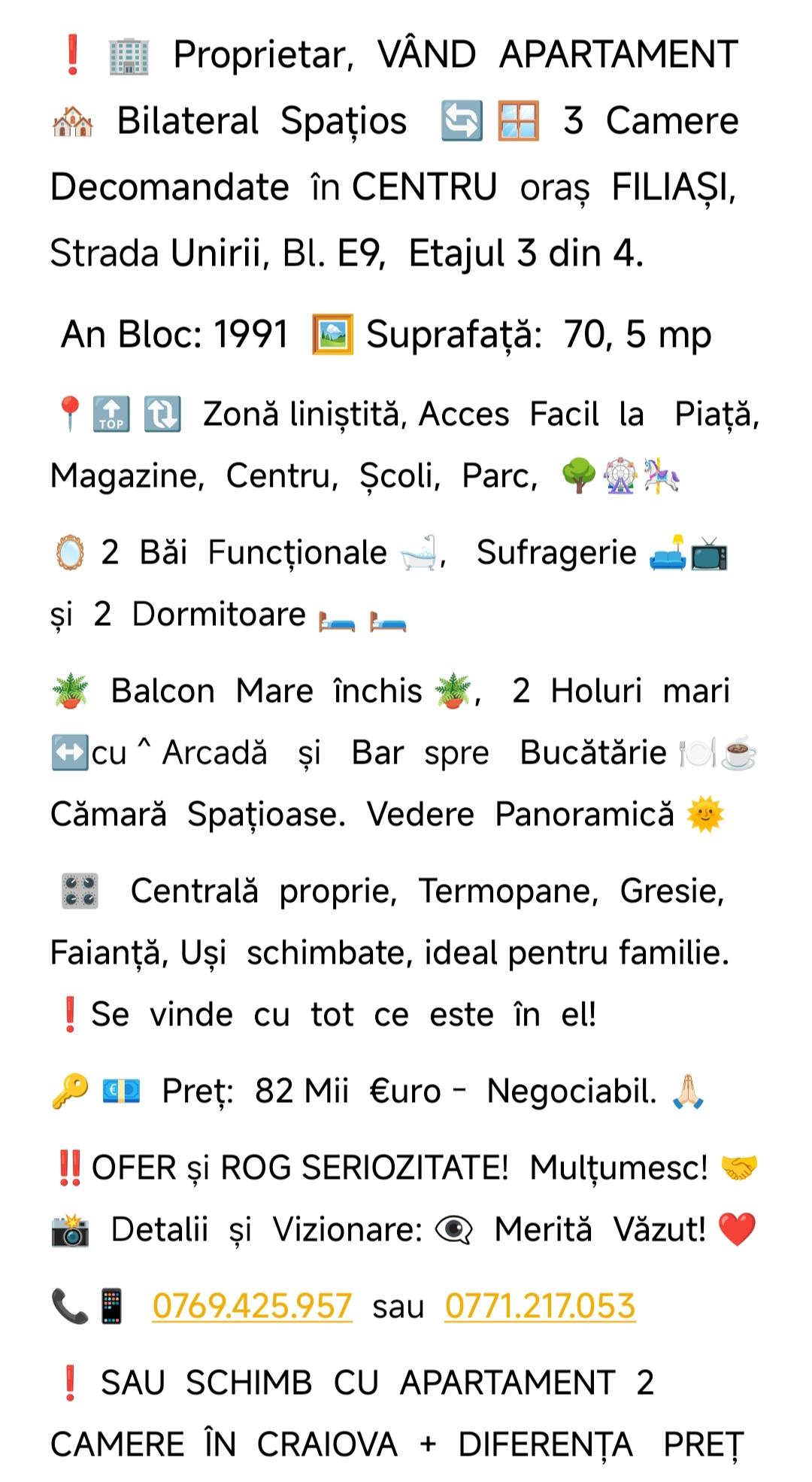❗ 🏢 Proprietar, VÂND APARTAMENT 🏘️ Bilateral Spațios 🔄 🪟 3 Camere Decomandate în CENTRU oraș FILIAȘI, Strada Unirii, Bl. E9, Etajul 3 din 4.