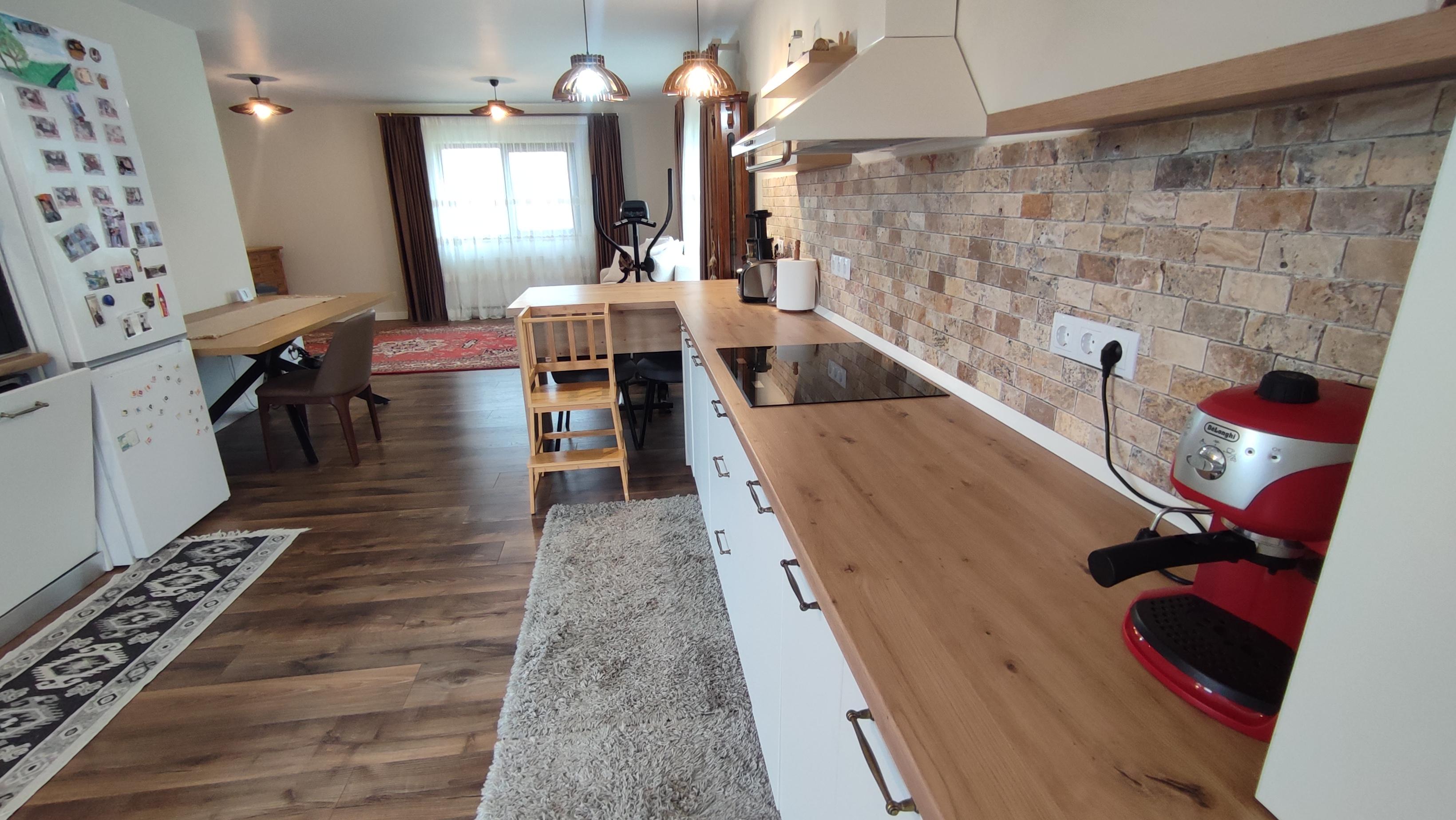 Living spațios cu bucătărie open space, conceput pentru a oferi lumină naturală și un ambient plăcut