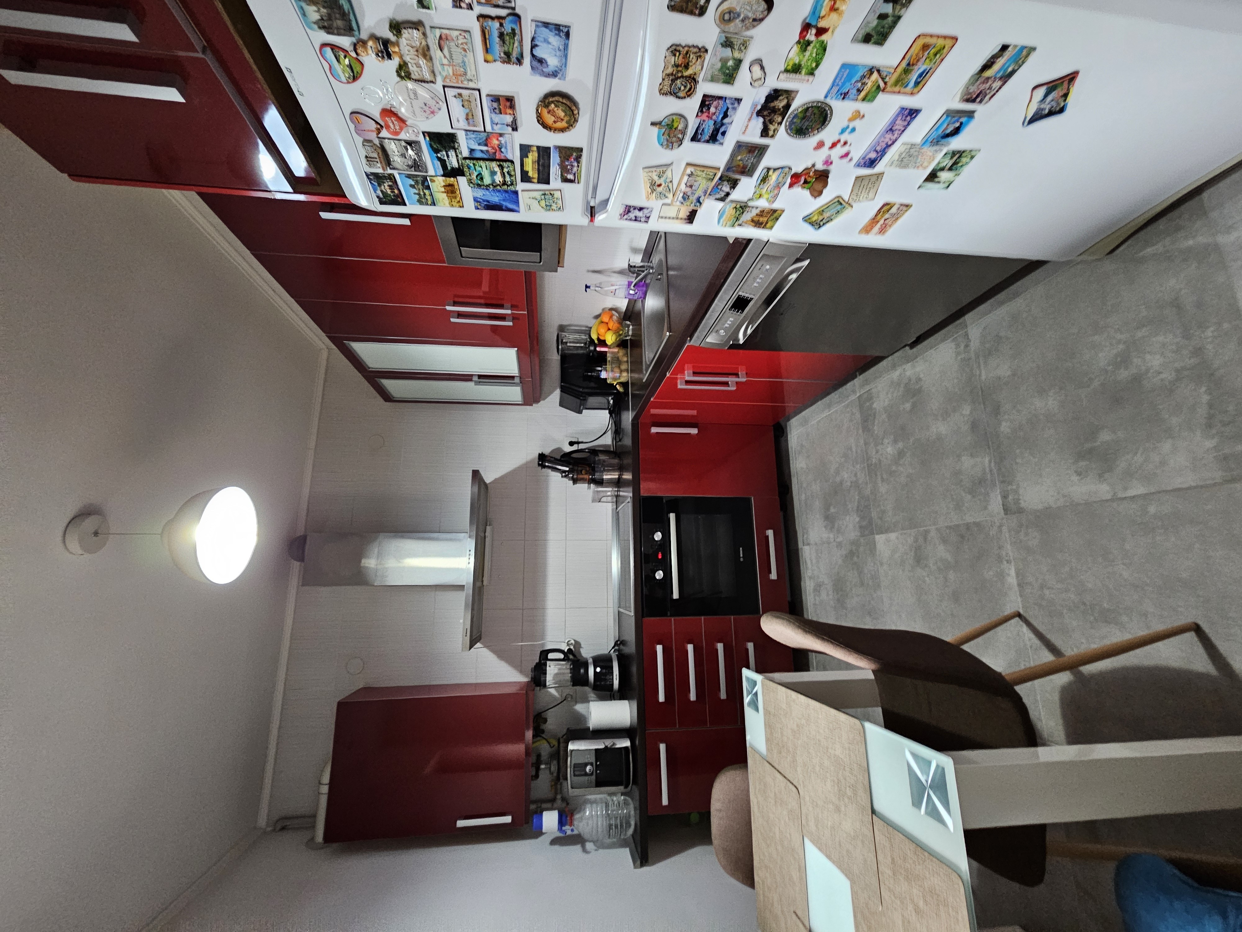 Bucatarie : mobila, hota, cuptor electric, plita electrica, masina de spalat vase, cuptor microunde si frigider.