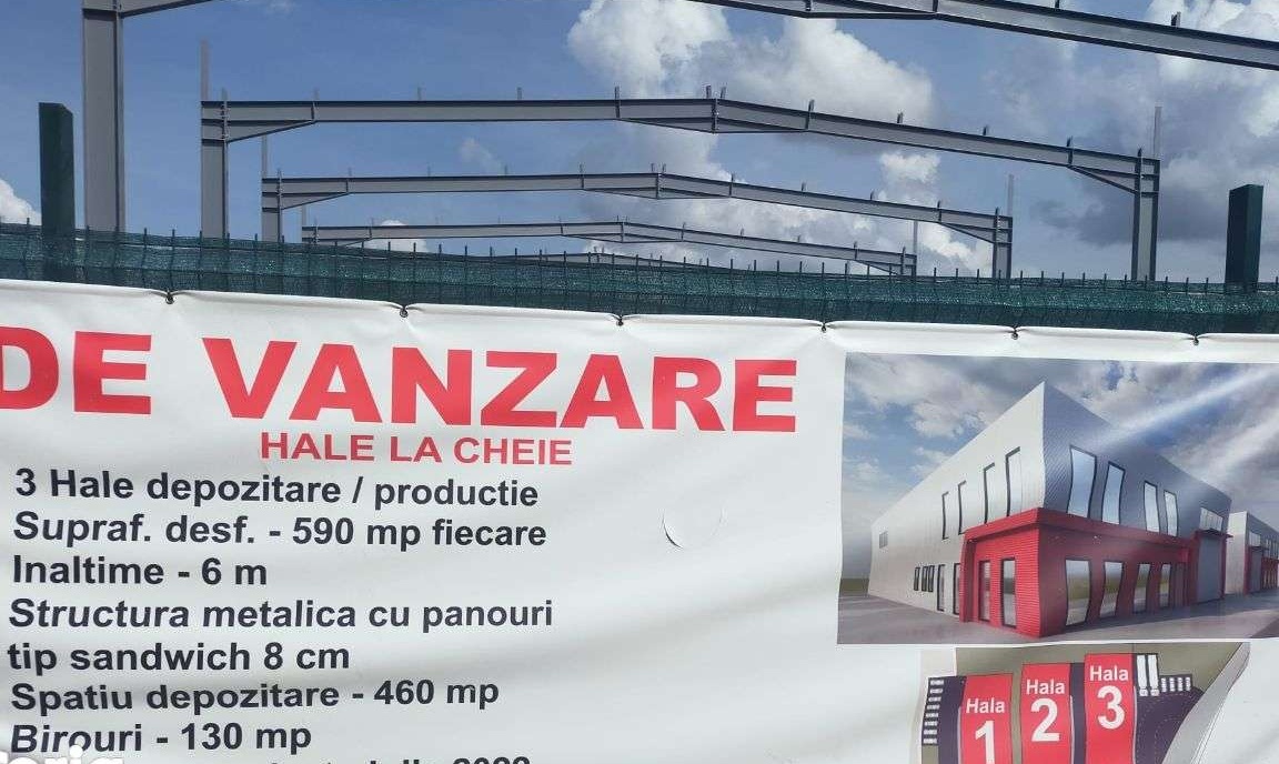 Va propunem la vanzare 3 hale pentru depozitare sau productie la iesirea din Floresti, fiecare cu suprafata de 590 mp si 800 mp de teren cu tot cu amprenta la sol.Constructia este pe structura metalica cu panouri tip sandwich de 8 cm.Vor fi 130 mp spatii de birouri, vestiare si grupuri sanitare si 460 mp de spatiu liber pentru depozitare sau productie.Finalizarea si predarea va fi spre sfarsitul anului.Mai multe detalii vom discuta la vizionare, asa ca, va asteptam.