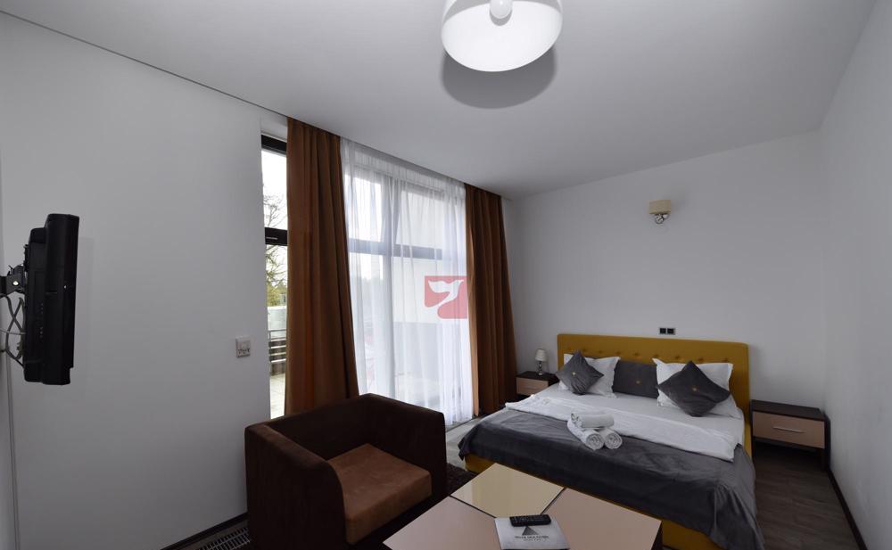 Acest studio deosebit, mobilat, utilat, este situat in Complexul Silver Mountain din Poiana Brasov, dotat cu loc de joaca pentru copii, terenuri de tenis, badminton, minifotbal, mese de ping-pong, bancute si foisoare, in complex fiind si un restaurant, piscine, spa, sali de conferinta samd.Are o zona de dormitor, una de bucatarie si dining, o baie, un dressing. Vedere frumoasa, catre vest, acces pe o terasa superba, de cca 100 mp..Renovat 2018, mobilat, actualmente inchiriat, prin urmare se poate viziona doar cu programare prealabila, exclus turism imobiliar.Imobilul dispune si de un loc mare de parcare in subteran, achizitionabil eventual separat, evaluat la 12.600 euro, exclusiv TVAPretul pentru acest pachet integral (cu parcare) este de 112.600 euro, fix, exclusiv TVA, daca achizitia o face o persoana fizica.Proprietarul actual este o firma platitoare de TVA, dar daca se cumpara tot de catre o firma platitoare, TVA nu se mai achita. Se accepta si formule de plata in rate.Colaboram stimulativ cu alte agentii imobiliare, imobilul fiind in reprezentare exclusiva.