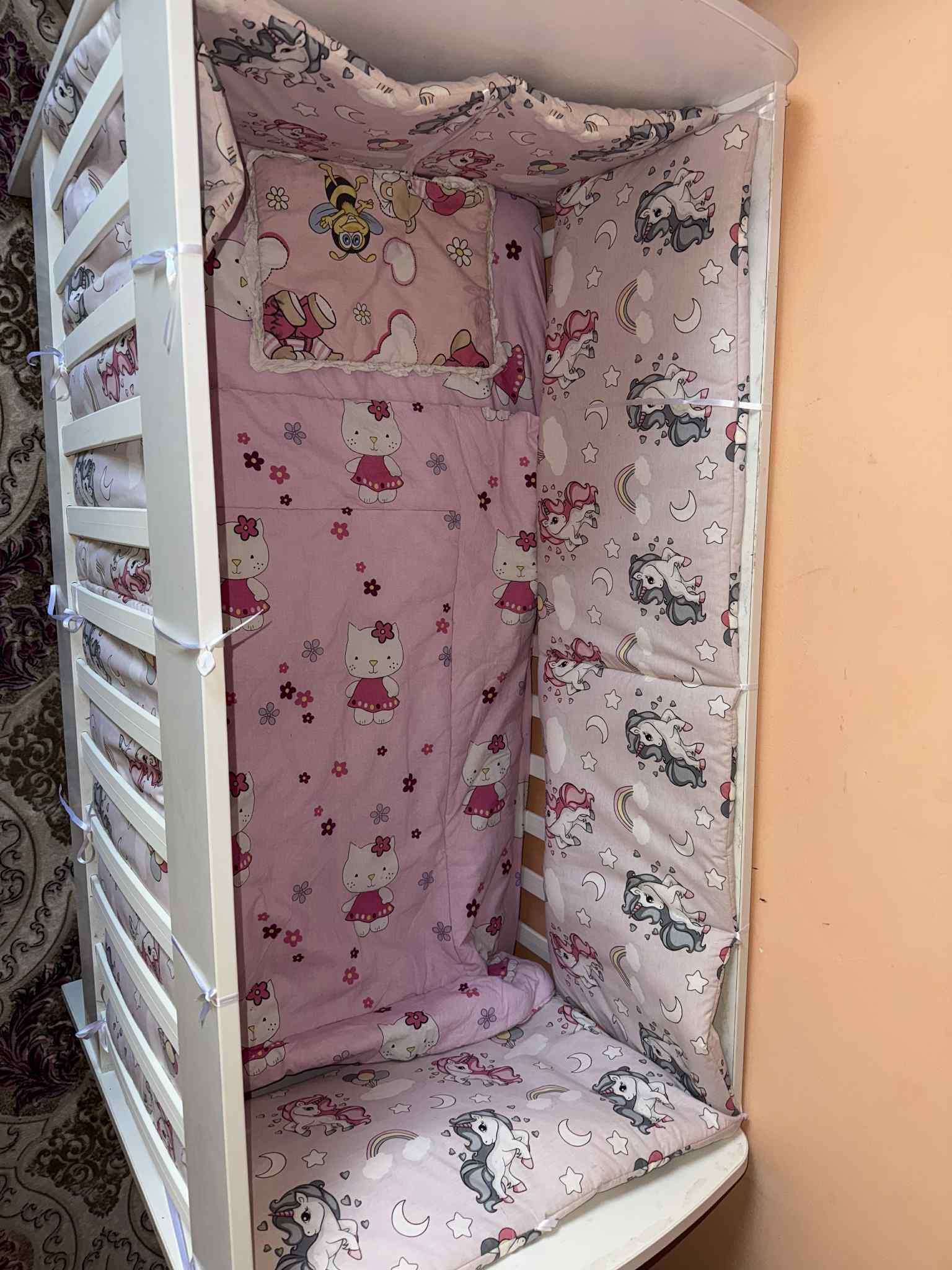 pătuț din lemn pentru bebe cu 3 im nivele cu saltea inclusă 120x60 + pernuță plăpumioară, set lenjerie huse pentru saltea , apărători pentru pătuț.