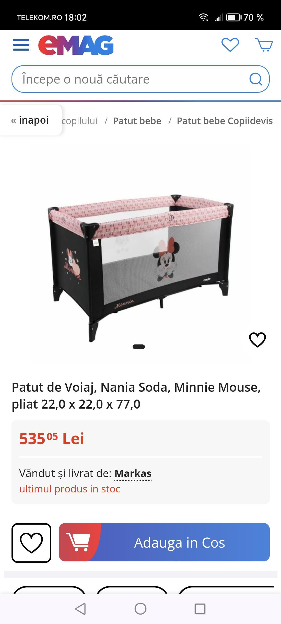 Vând pătuț pliabil de voiaj ,Nania Soda, model Minnie Mouse , pliat 22,0 × 22,0 ×77,0 . Pătuțul este ca nou .