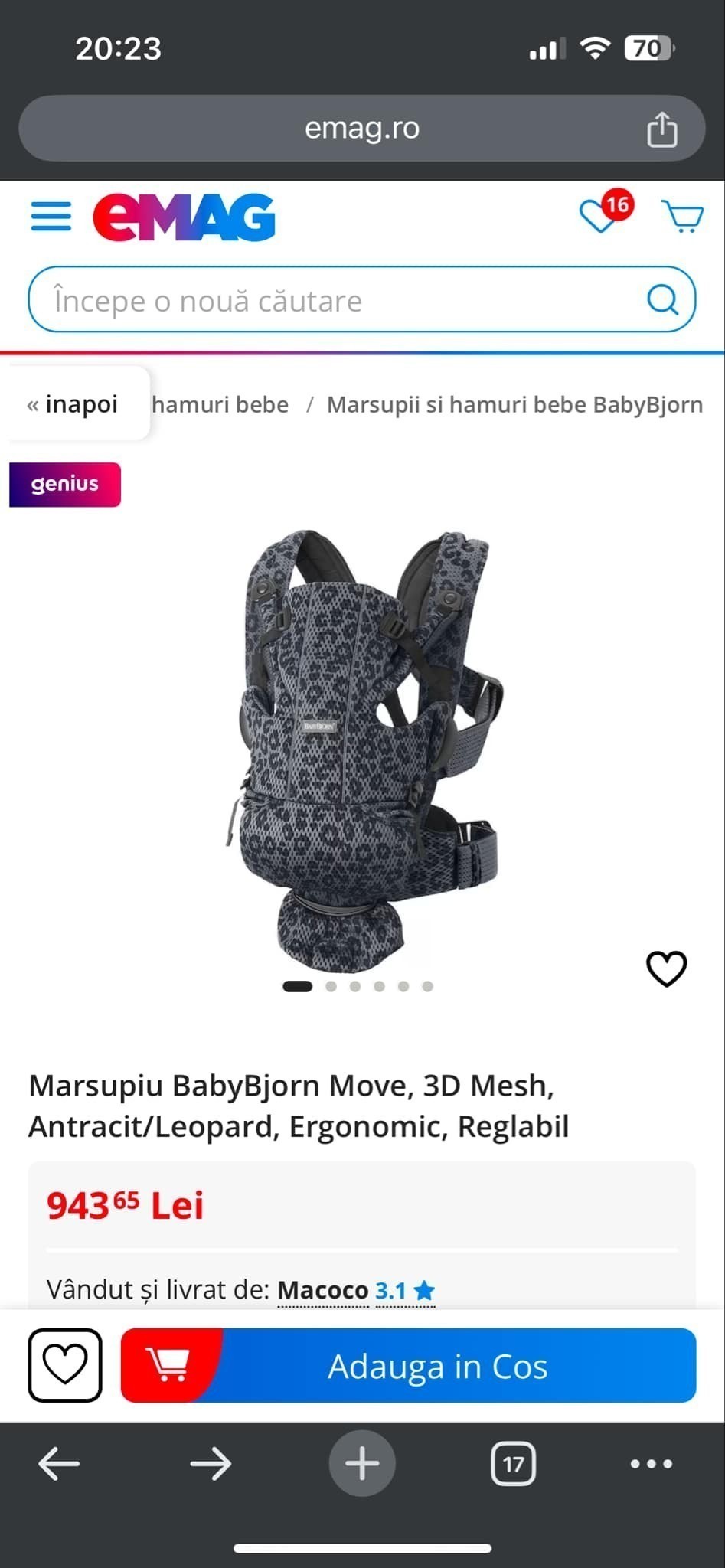 Se poate folosi de la nastere pana la varsta de 15 luni (greutate minima 3,2 kg, maxim 12 kg). Pret 550 ron.