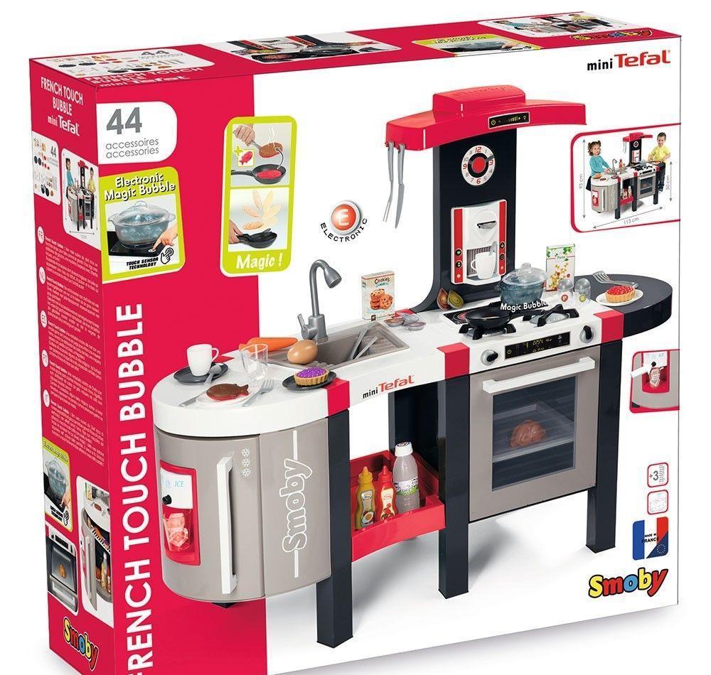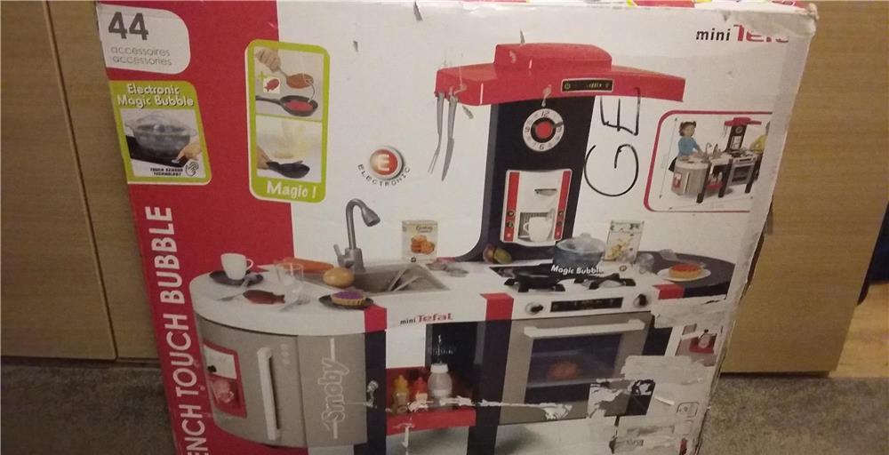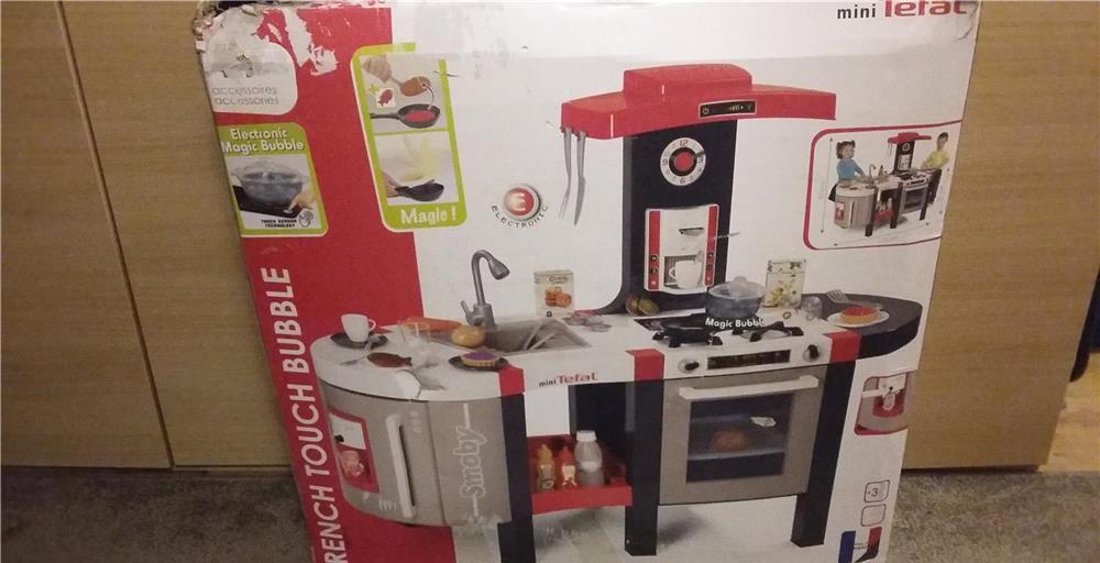 Bucatarie Smoby Tefal French Touch Bubble cu oala magica si accesorii.Bucataria este noua, in ambalajul original. Ambalajul este mai uzat, dar bucataria este noua, nu a fost montata. Lipsesc cateva piese, dar bucataria se poate monta. Am atasat si doua poze cu ce trebuie sa contina bucataria. Am marcat cu galben piesele care lipsesc. La partea curbata din stanga lipseste fundul corpului, iar la o laterala este rupta o clema. In cel mai rau caz nu se poate monta partea aceasta, dar sigur se poate improviza ceva. Am incercuit intr-o imagine partea care are probleme. Mai lipsesc, manerele, butoanele si gratarele de la plita. In rest toate accesoriile sunt in pungi, nedesfacute. Pentru detalii va rog contactati-ma.Varsta recomanda: 3 ani +Dimensiuni produs (LxlxH): 113,5 x 40 x 93 cmInaltimea blatului: 50 cmGreutate: 9,8 kgPret 150 lei