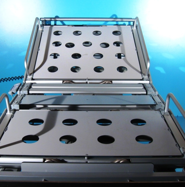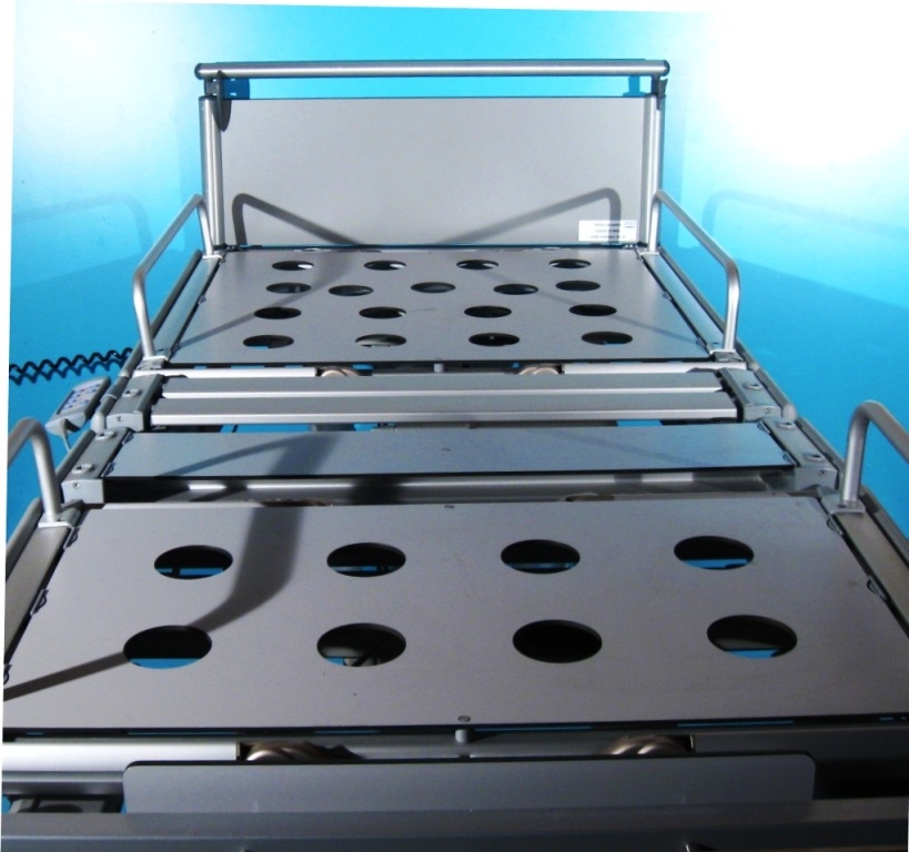 Pat ATI cu 4 functii actionate electric cu ajutorul a doua telecomenzi, una pentru pacient si un panou de comanda pentru cadrele medicale situata la capatul patului: sectiunea spate, sectiunea coapse si sectiunea gamba, inaltimea patului sus – jos.