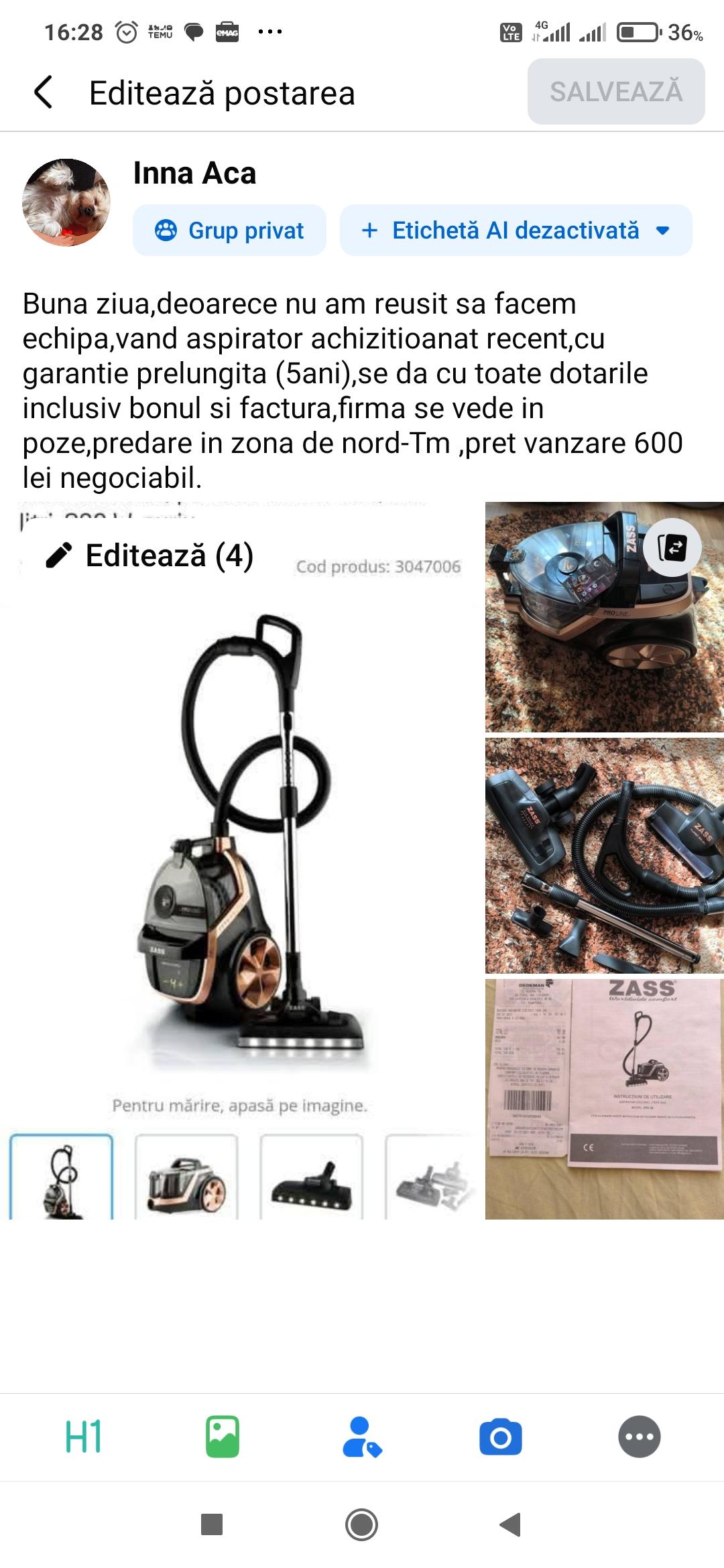 Buna ziua,,vand aspirator achizitioanat recent,cu garantie prelungita (5ani),se da cu toate dotarile inclusiv bonul si factura,firma se vede in poze ,pret redus 550 lei plus taxe daca se trimite prin curier