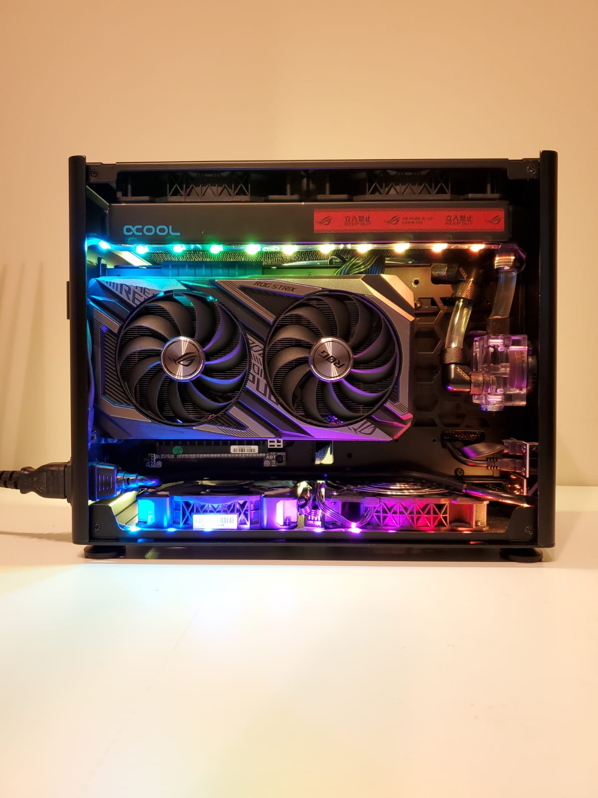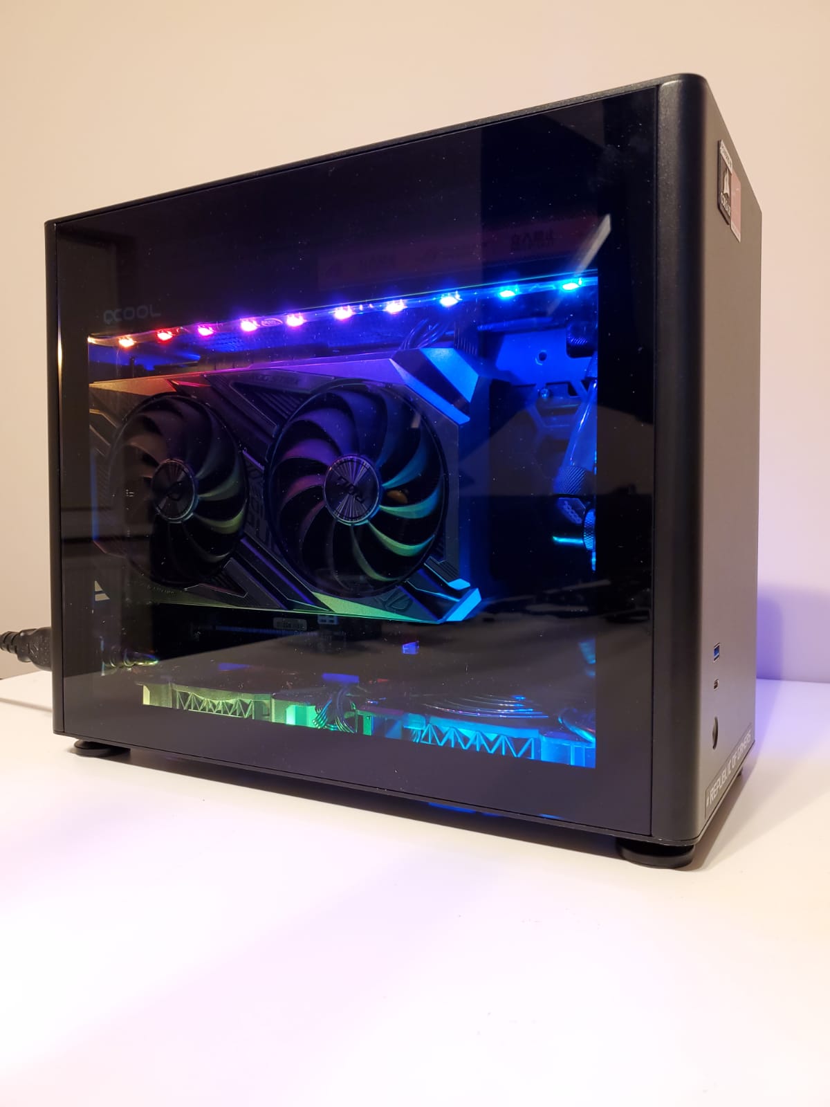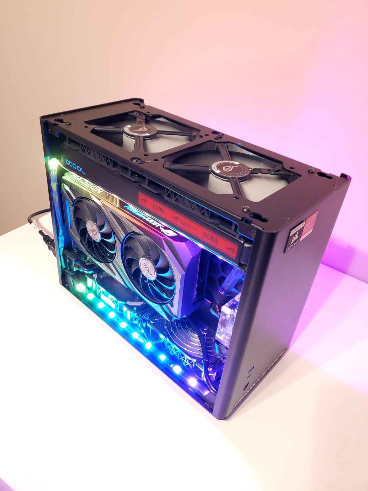 Carcasă Jonsbo A4 ventilatoarele sunt Corsair ML 2x120 si 2x140 i-am cumpărat și cablu pcie 4.0 la 180° special pentru itx foarte rar 4 benzi rgb.