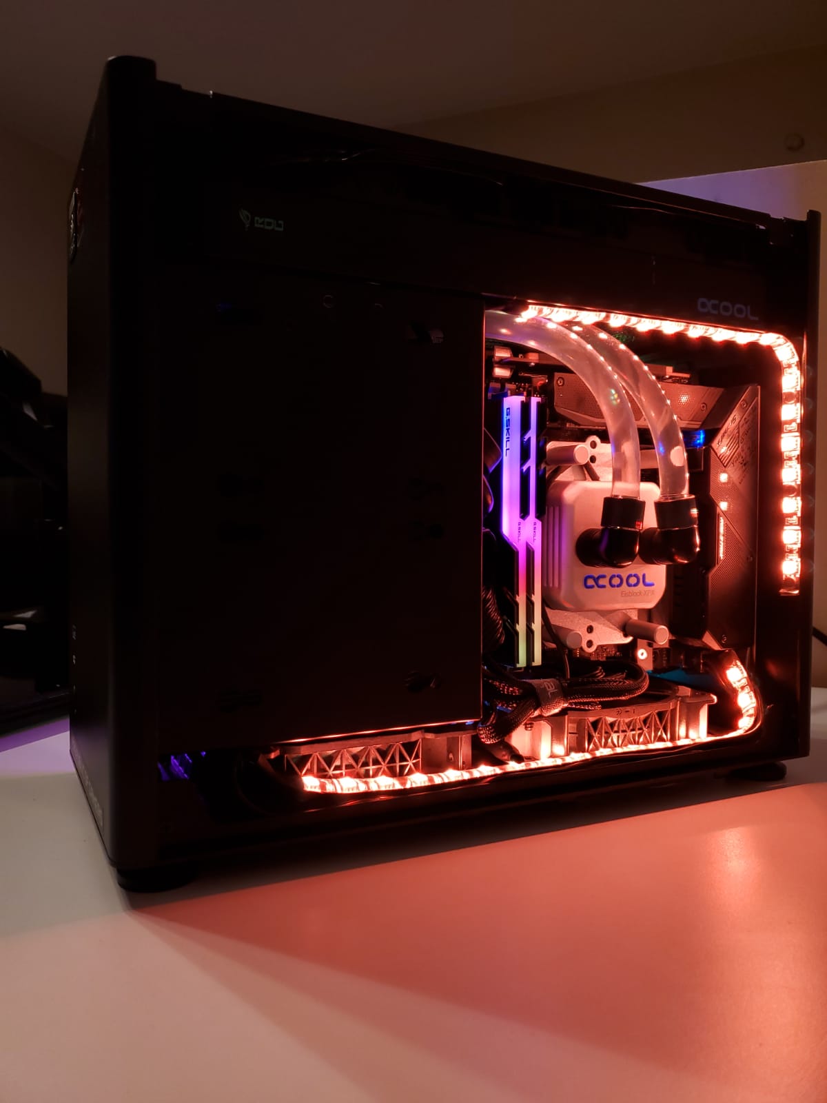 Cooler Procesor este custom făcut mai mult pe alphacool ceea ce a costat dublu față de unul normal pe apă recent i-am skimbat lichidul pe rosu de la ek.