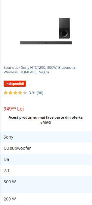 Soundbar Sony CT290 300W Bluetooth Wireless HDMI ARC NegruSpecificatiiCARACTERISTICI GENERALEDesign soundbar Cu subwooferSubwoofer wireless DaNumar canale 2.1Putere 300 WPutere soundbar 200 WPutere subwoofer 100 WCuloare NegruCONECTIVITATEConectivitate BluetoothUSBVersiune Bluetooth 4.2Conectori intrare 1 x USB1 x OpticalConectori iesire 1 x HDMI ARCCARACTERISTICI SUNETTehnologii audio Dolby DigitalCaracteristici speciale S-Force PRO Front SurroundALIMENTAREConsum subwoofer 15 WConsum soundbar 40 WPutere consumata in stand-by 0.5 WDIMENISUNIDimensiune soundbar 90 x 8.6 x 5.2 cmDimensiune subwoofer 17 x 36.2 x 34.2 cmGreutate soundbar 2.3 KgGreutate subwoofer 6.3 KgACCESORIIContinut pachet 1 x Telecomanda