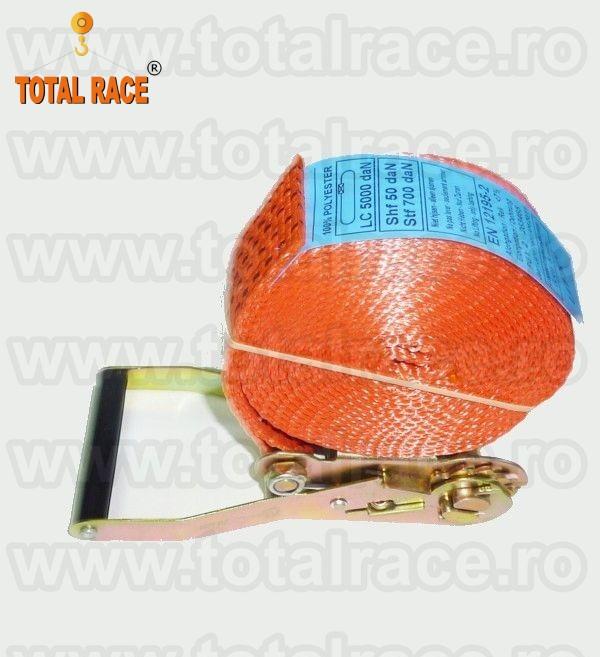 Total Race Romania livreaza din stoc chingi de ancorare sistem 50A mm cu latime banda 50 mm , in conformitate cu EN 12195 – 2 , elongatie < 7 % cu clichet, din 2 parti , carlige diverse modele(de exemplu carlige ancorare tip gheara duble , gheara simplu , carlige cu siguranta , carlige triunghi ), din poliester, culoare portocalie, 5 dungi negre. Capacitatea de ancorare este Lc 2500 daN drept si Lc 5000 daN peste incarcatura, eticheta ancorare - date de identificare produs. Chingile textile de ancorare sunt insotite de Declaratie de Conformitate. Se utilizeaza pentru legarea, ancorarea si protejarea marfurilor in timpul transportului, sunt chingi usor de folosit si nu deterioreaza marfa.