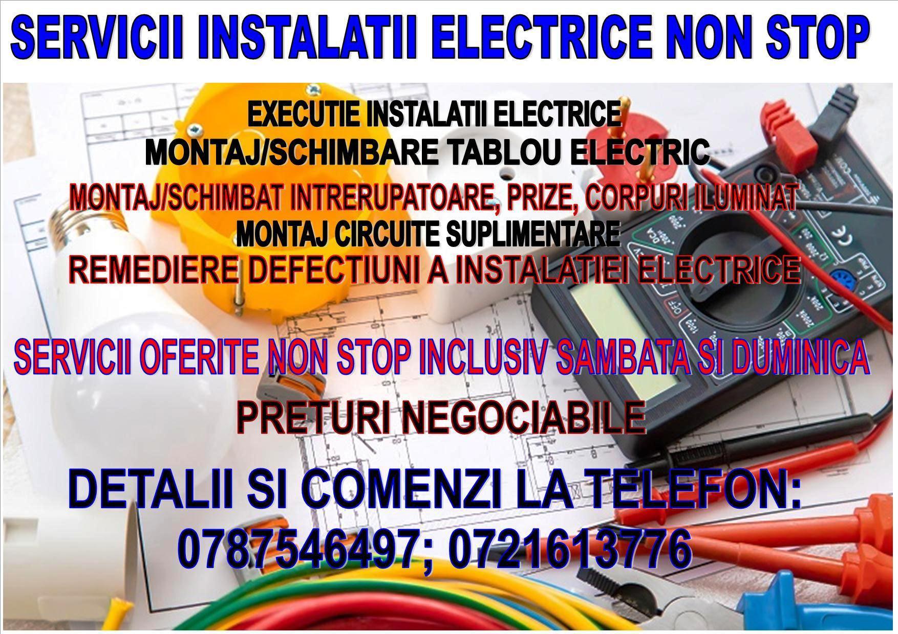 Servicii instalatii electrice : executie instalatii electrice,montaj/schimbare tablou electric, montaj circuite suplimentare, remediere defectiuni ale instalatiei electrice, Montaj/schimbat prize, intrerupatoare, corpuri de iluminat, etc, remediere defectiuni ale instalatiei electrice , prize, intrerupatoare, corpuri de iluminat, etc. Servicii NON STOP inclusiv Sambata si Duminica. Preturi negociabile, reduceri pentru pensionari si comenzi ferme.