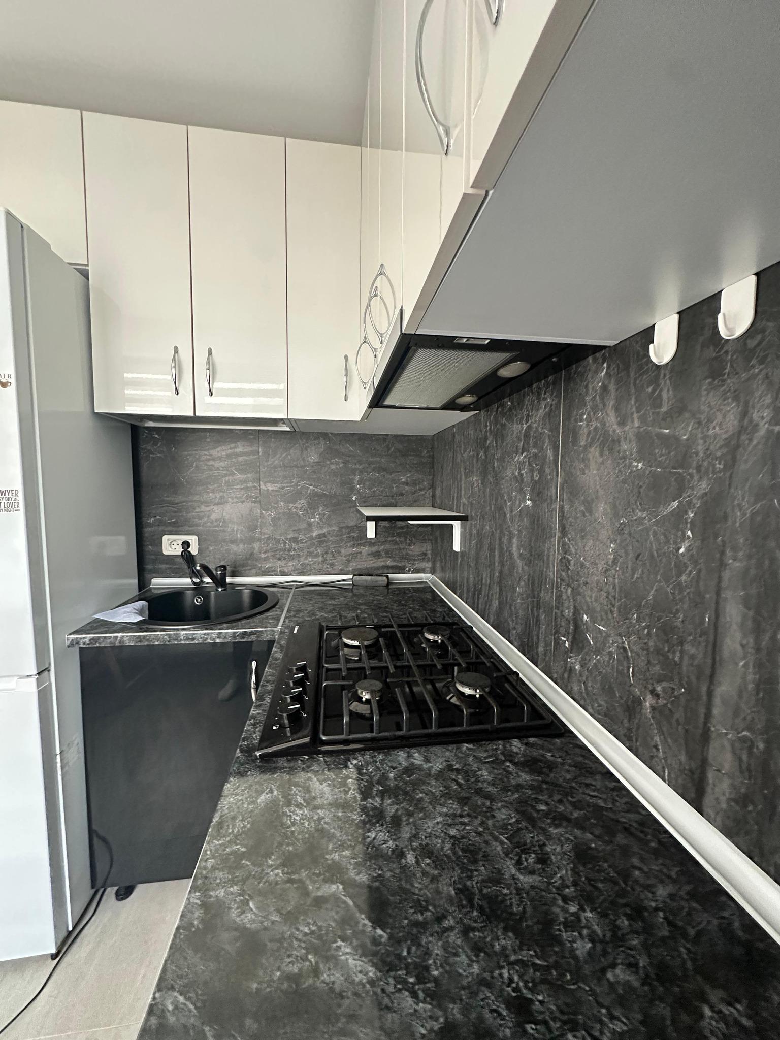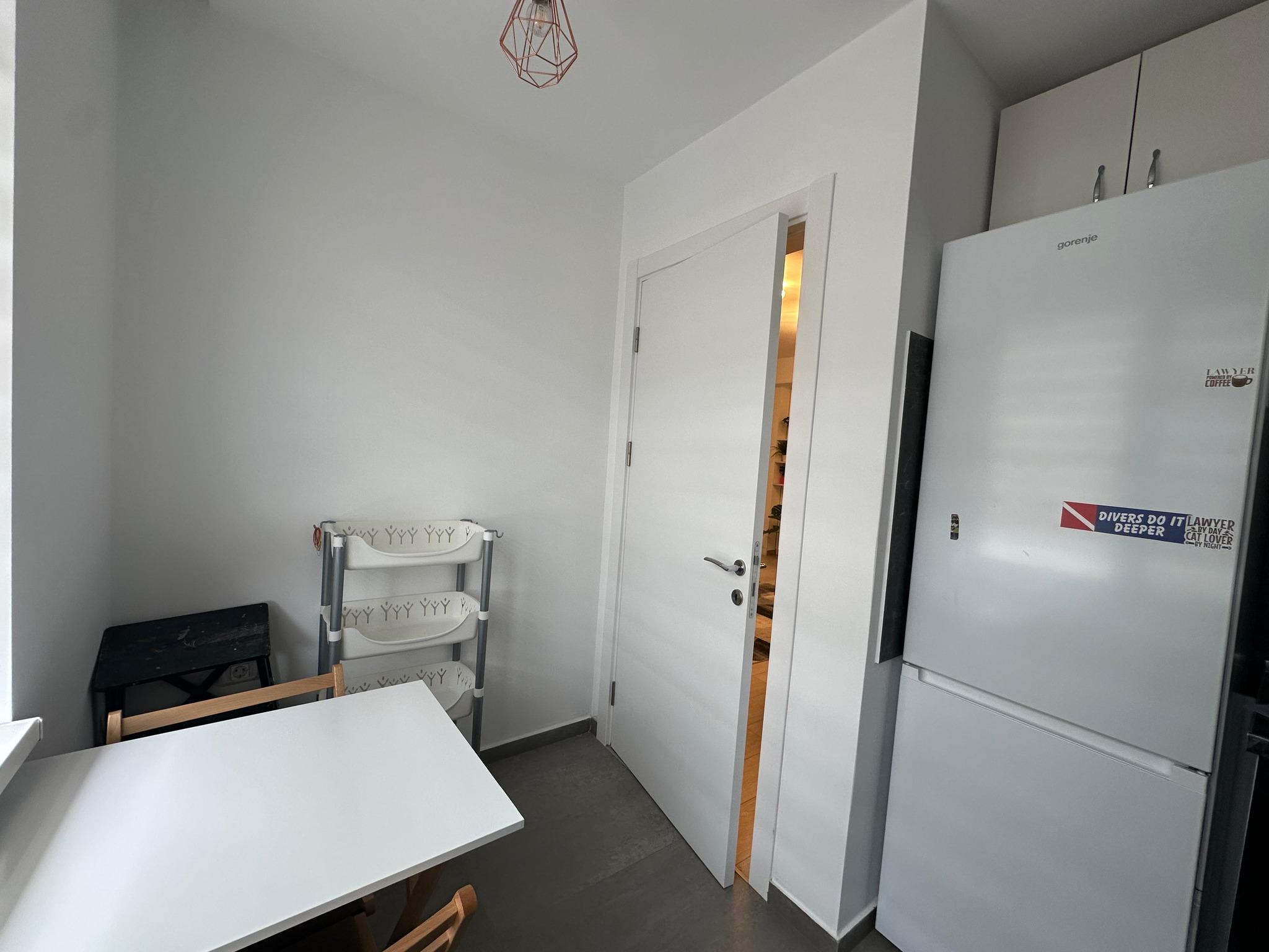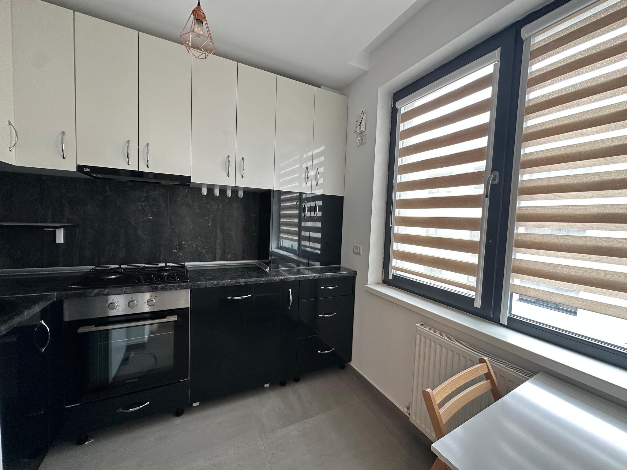 Bucătărie: mobilă MDF pe comandă, cuptor electric Heinner, plită gaz Heinner, combină frigorifică Gorenje, mașină de spălat vase Whirlpool încorporată, centrală termică Viessmann, masă cu 2 scaune pliabile, jaluzele tip zebra;