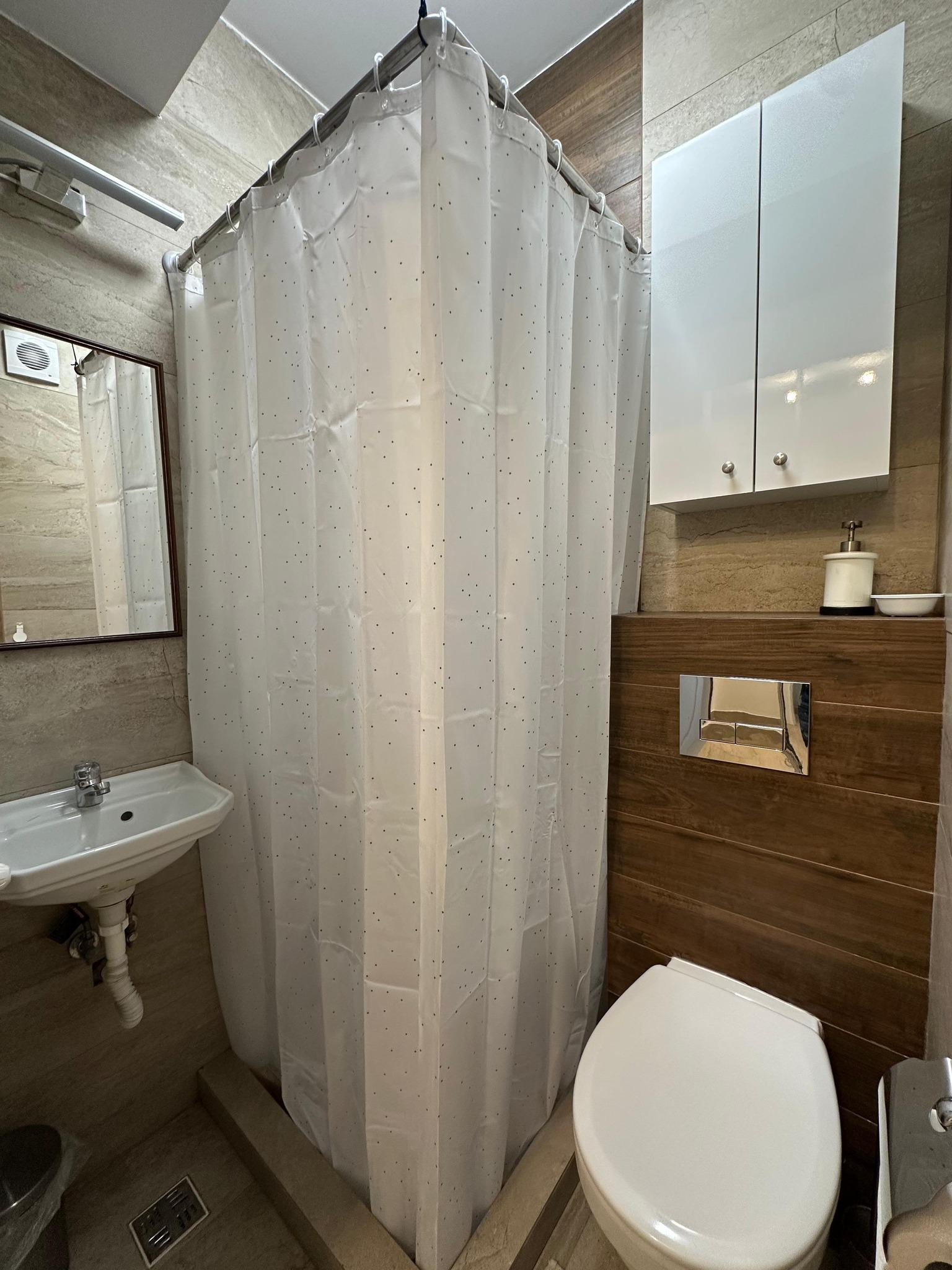 Baie mică: cabină de duș cu rigolă și perdea, chiuvetă, dulap, vas WC suspendat;
