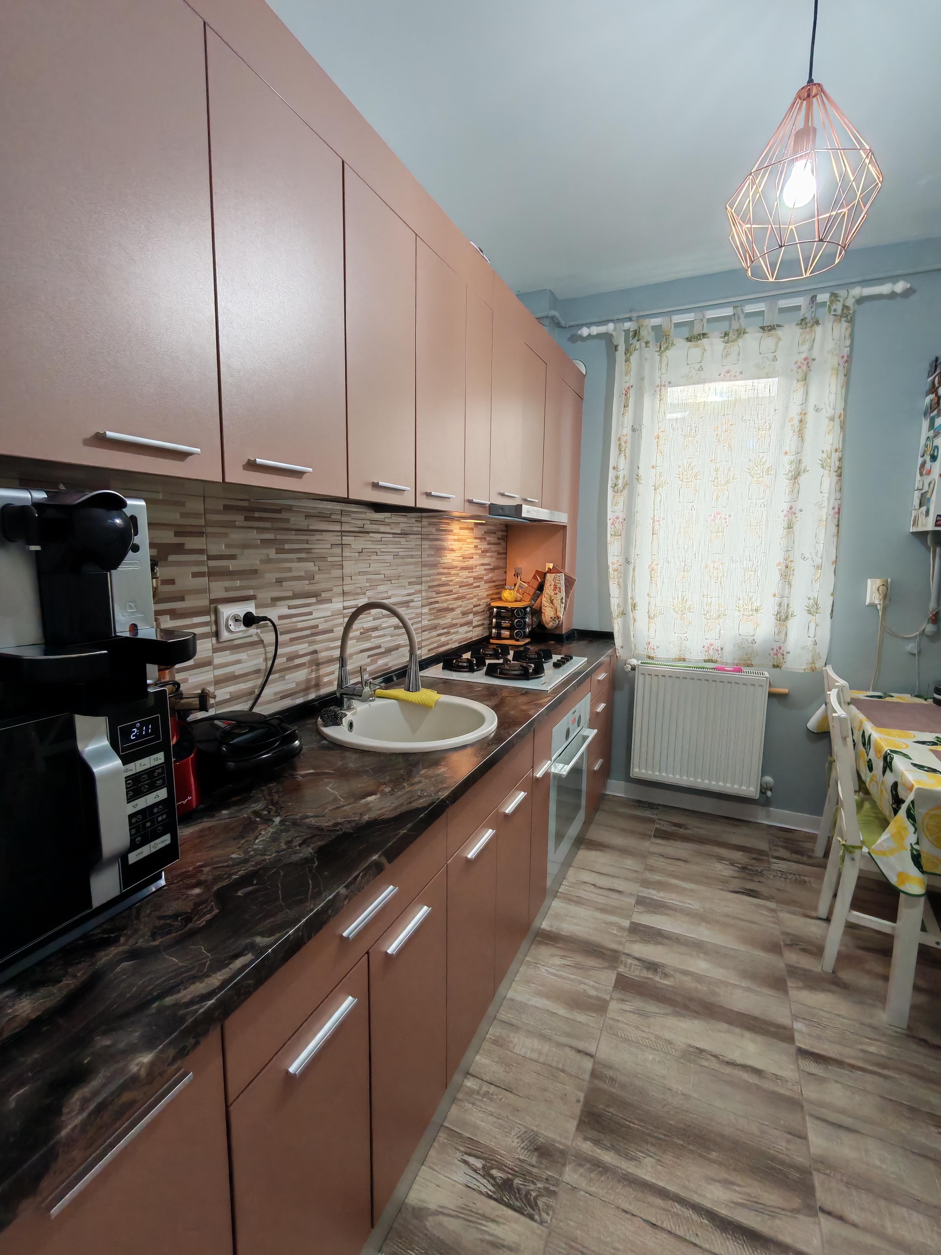 -bucatarie complet echipata (mobila facuta pe comanda, plita pe gaz, cuptor electric, cuptor microunde, frigider, masa cu 4 scaune)