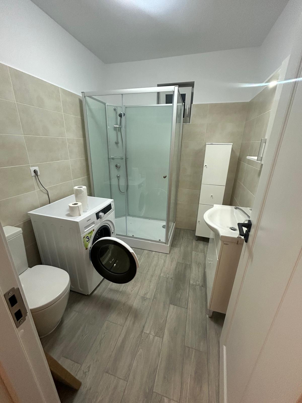 Apartamentul se afla într-un bloc nou si dispune de toate utilitățile  este compus din 2camere decomandate, bucătărie mobilata,baie cu cabina de dus si mașina de spălat un hol din care se întra în toate încăperile si un balcon de 12mp în care se iasă din fiecărei camera